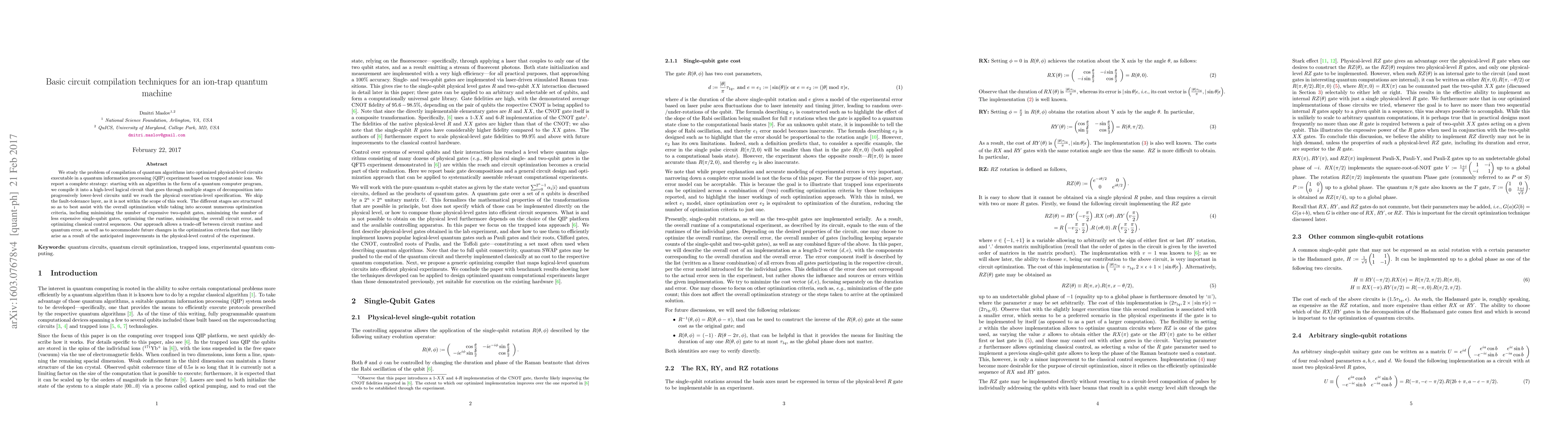 This paper presents a comprehensive strategy for compiling quantum algorithms into optimized circuits for a trapped ion quantum information processing system, focusing on minimizing gate counts and errors while accommodating future optimization criteria. The compilation process involves multiple stages of decomposition, excluding fault-tolerance considerations.