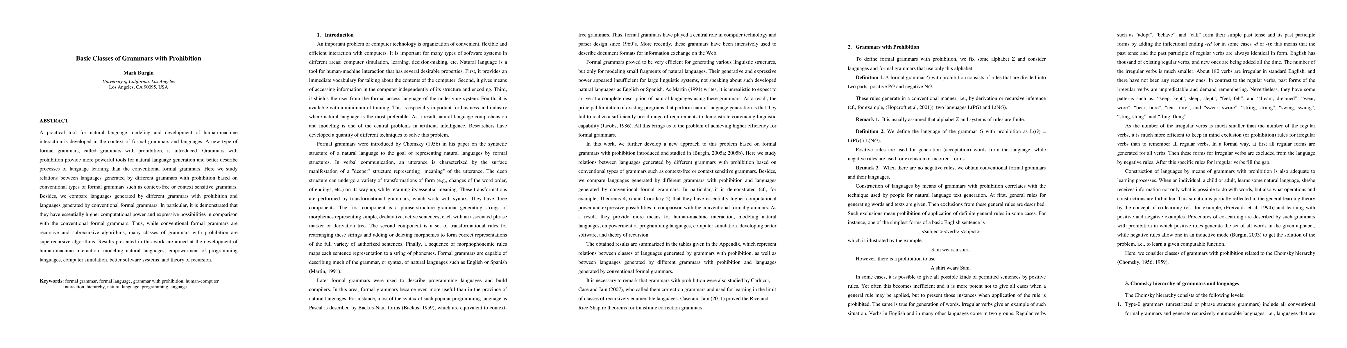 A practical tool for natural language modeling and development of human-machine interaction is developed in the context of formal grammars and languages. A new type of formal grammars, called grammars with prohibition, is introduced. Grammars with prohibition provide more powerful tools for natural language generation and better describe processes of language learning than the conventional formal grammars. Here we study relations between languages generated by different grammars with prohibition based on conventional types of formal grammars such as context-free or context sensitive grammars. Besides, we compare languages generated by different grammars with prohibition and languages generated by conventional formal grammars. In particular, it is demonstrated that they have essentially higher computational power and expressive possibilities in comparison with the conventional formal grammars. Thus, while conventional formal grammars are recursive and subrecursive algorithms, many classes of grammars with prohibition are superrecursive algorithms. Results presented in this work are aimed at the development of human-machine interaction, modeling natural languages, empowerment of programming languages, computer simulation, better software systems, and theory of recursion.