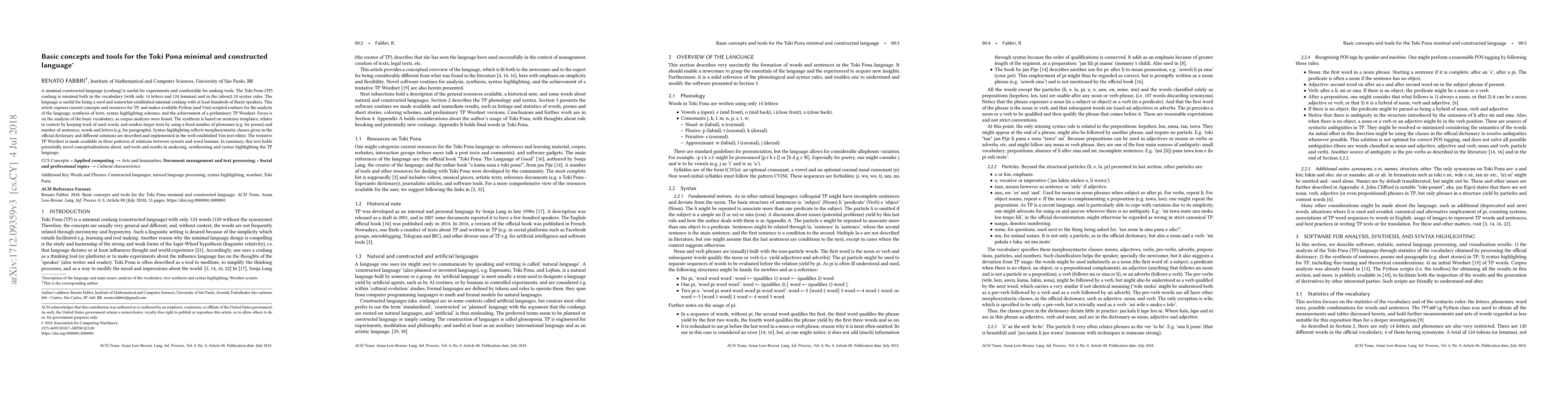 A minimal constructed language (conlang) is useful for experiments and comfortable for making tools. The Toki Pona (TP) conlang is minimal both in the vocabulary (with only 14 letters and 124 lemmas) and in the (about) 10 syntax rules. The language is useful for being a used and somewhat established minimal conlang with at least hundreds of fluent speakers. This article exposes current concepts and resources for TP, and makes available Python (and Vim) scripted routines for the analysis of the language, synthesis of texts, syntax highlighting schemes, and the achievement of a preliminary TP Wordnet. Focus is on the analysis of the basic vocabulary, as corpus analyses were found. The synthesis is based on sentence templates, relates to context by keeping track of used words, and renders larger texts by using a fixed number of phonemes (e.g. for poems) and number of sentences, words and letters (e.g. for paragraphs). Syntax highlighting reflects morphosyntactic classes given in the official dictionary and different solutions are described and implemented in the well-established Vim text editor. The tentative TP Wordnet is made available in three patterns of relations between synsets and word lemmas. In summary, this text holds potentially novel conceptualizations about, and tools and results in analyzing, synthesizing and syntax highlighting the TP language.