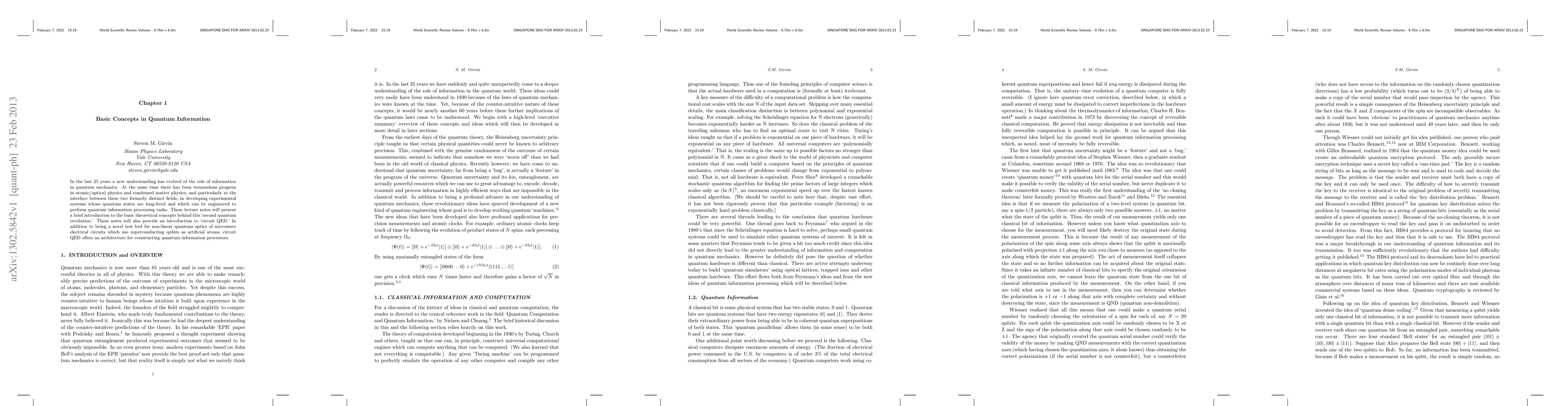 This paper introduces fundamental theoretical concepts in quantum information, highlighting the "second quantum revolution" and the development of long-lived quantum states for information processing. It also explores "circuit QED," a novel platform for quantum information processing using superconducting qubits in microwave circuits.