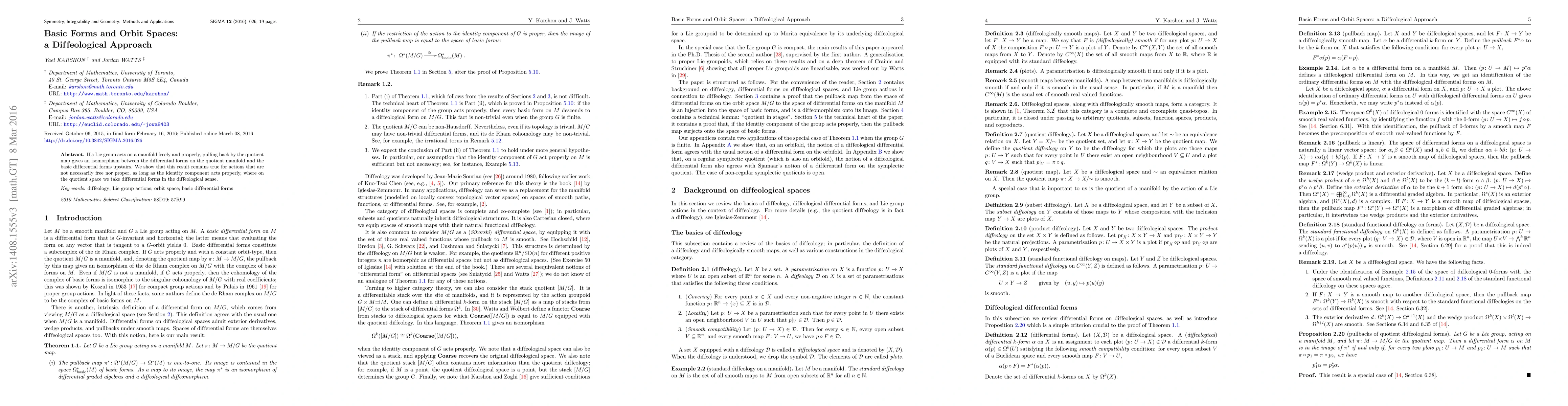If a Lie group acts on a manifold freely and properly, pulling back by the quotient map gives an isomorphism between the differential forms on the quotient manifold and the basic differential forms upstairs. We show that this result remains true for actions that are not necessarily free nor proper, as long as the identity component acts properly, where on the quotient space we take differential forms in the diffeological sense.