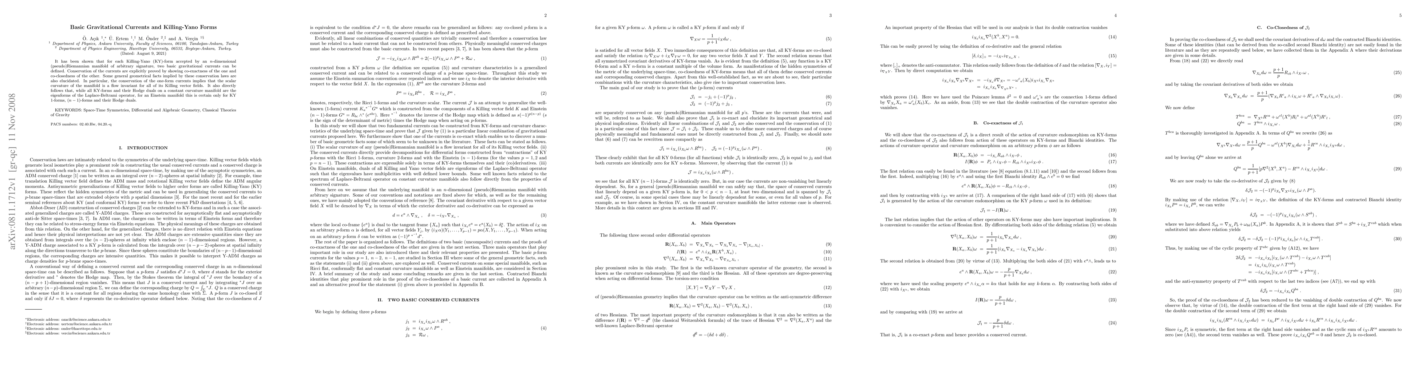 This paper demonstrates that for every Killing-Yano form on an n-dimensional (pseudo)Riemannian manifold, two gravitational currents can be defined, proving their conservation. It highlights that the scalar curvature is a flow invariant for Killing vector fields, and on constant curvature manifolds, KY-forms and their duals are eigenforms of the Laplace-Beltrami operator. For Einstein manifolds, this holds true only for KY 1-forms, (n-1)-forms, and their duals.