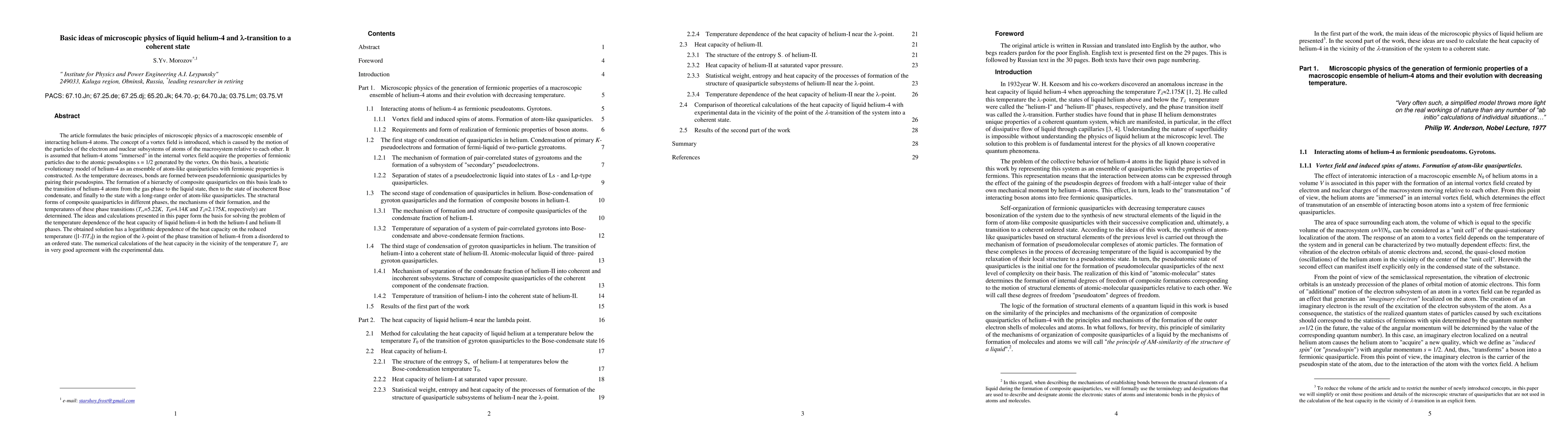 The article formulates the basic principles of microscopic physics of a macroscopic ensemble of interacting helium-4 atoms. The concept of a vortex field is introduced, which is caused by the motion of the particles of the electron and nuclear subsystems of atoms of the macrosystem relative to each other. It is assumed that helium-4 atoms "immersed" in the internal vortex field acquire the properties of fermionic particles due to the atomic pseudospins s=1/2 generated by the vortex. On this basis, a heuristic evolutionary model of helium-4 as an ensemble of atom-like quasiparticles with fermionic properties is constructed. As the temperature decreases, bonds are formed between pseudofermionic quasiparticles by pairing their pseudospins. The formation of a hierarchy of composite quasiparticles on this basis leads to the transition of helium-4 atoms from the gas phase to the liquid state, then to the state of incoherent Bose condensate, and finally to the state with a long-range order of atom-like quasiparticles. The structural forms of composite quasiparticles in different phases, the mechanisms of their formation, and the temperatures of these phase transitions ($T_{cr}=5.22K$, $T_0=4.14K$ and $T_\lambda=2.175K$, respectively) are determined. The ideas and calculations presented in this paper form the basis for solving the problem of the temperature dependence of the heat capacity of liquid helium-4 in both the helium-I and helium-II phases. The obtained solution has a logarithmic dependence of the heat capacity on the reduced temperature (${|1-{T/T_\lambda}|}$) in the region of the $\lambda$-point of the phase transition of helium-4 from a disordered to an ordered state. The numerical calculations of the heat capacity in the vicinity of the temperature $T_\lambda$ are in very good agreement with the experimental data.