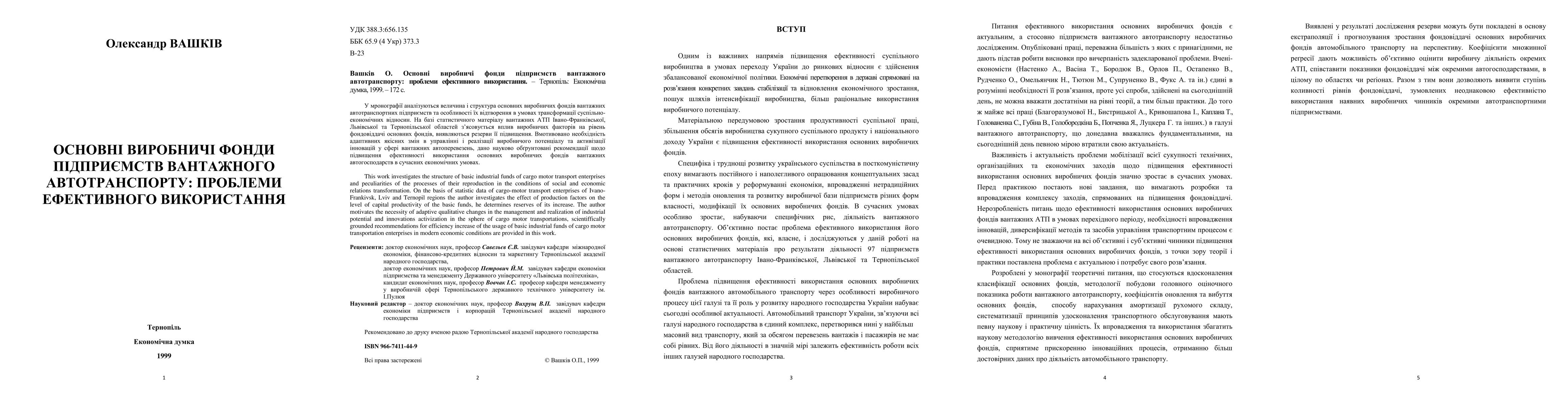This work investigates the structure of basic industrial funds of cargo motor transport enterprises and peculiarities of the processes of their reproduction in the conditions of social and economic relations transformation. On the basis of statistic data of cargo-motor transport enterprises of Ivano-Frankivsk, Lviv and Ternopil regions the author investigates the effect of production factors on the level of capital productivity of the basic funds, he determines reserves of its increase. The author motivates the necessity of adaptive qualitative changes in the management and realization of industrial potential and innovations activization in the sphere of cargo motor transportations, scientiffically grounded recommendations for efficiency increase of the usage of basic industrial funds of cargo motor transportation enterprises in modern economic conditions are provided in this work.