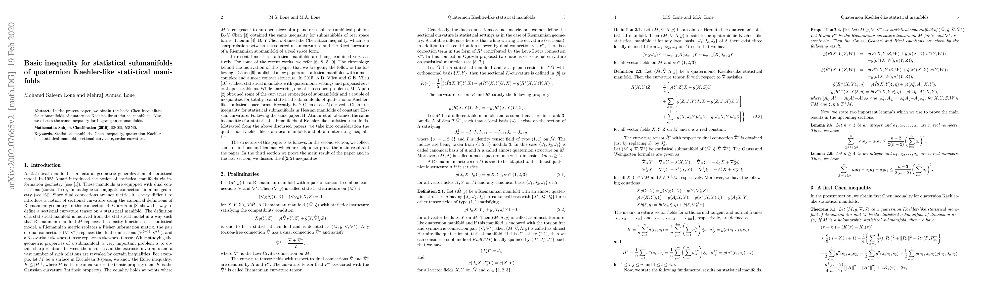 Summary: This paper establishes fundamental Chen inequalities for submanifolds within quaternion Kaehler-like statistical manifolds and extends these inequalities to Lagrangian submanifolds. The results provide new insights into the geometric properties of these complex structures.