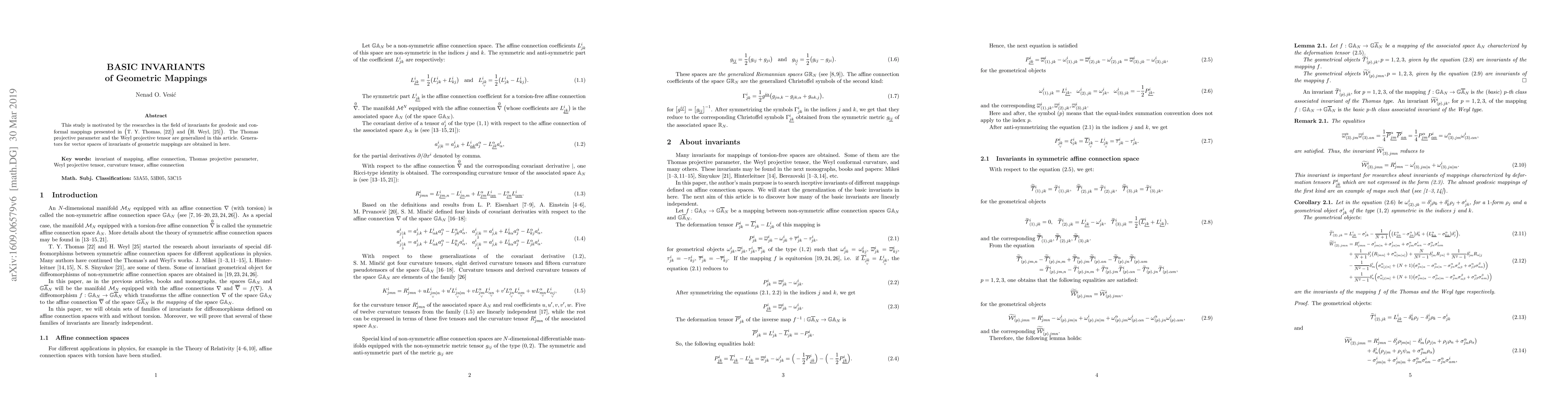 This study is motivated by the researches in the field of invariants of geodesic and conformal mappings presented in (T. Y. Thomas, [22]) and (H. Weyl, [25]). The Thomas projective parameter and the Weyl projective tensor are generalized in this article. Generators for vector spaces of invariants of geometric mappings are obtained in here.