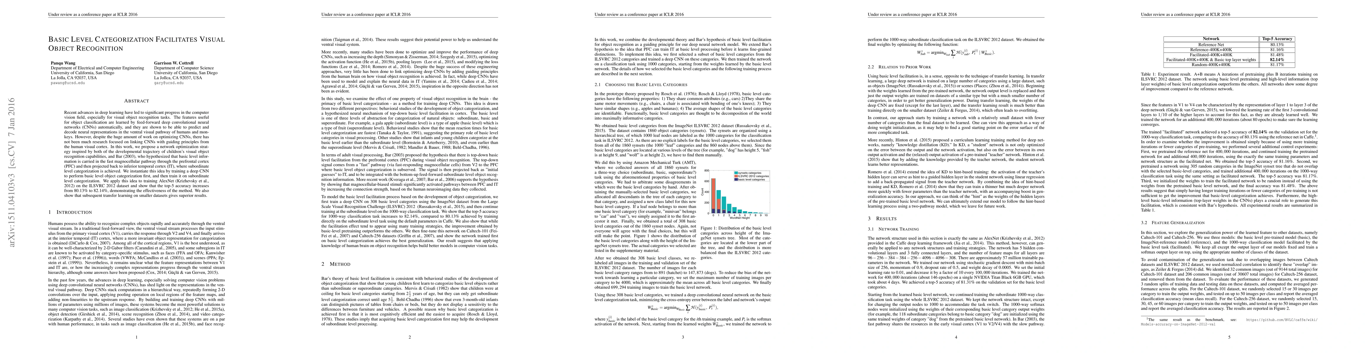 This paper proposes a network optimization strategy to enhance visual object recognition by training deep CNNs to first perform basic level categorization, followed by subordinate level categorization, inspired by developmental principles and neural pathways in the human visual cortex. The method improves AlexNet's top-5 accuracy on the ILSVRC 2012 dataset and shows superior transfer learning performance on smaller datasets.