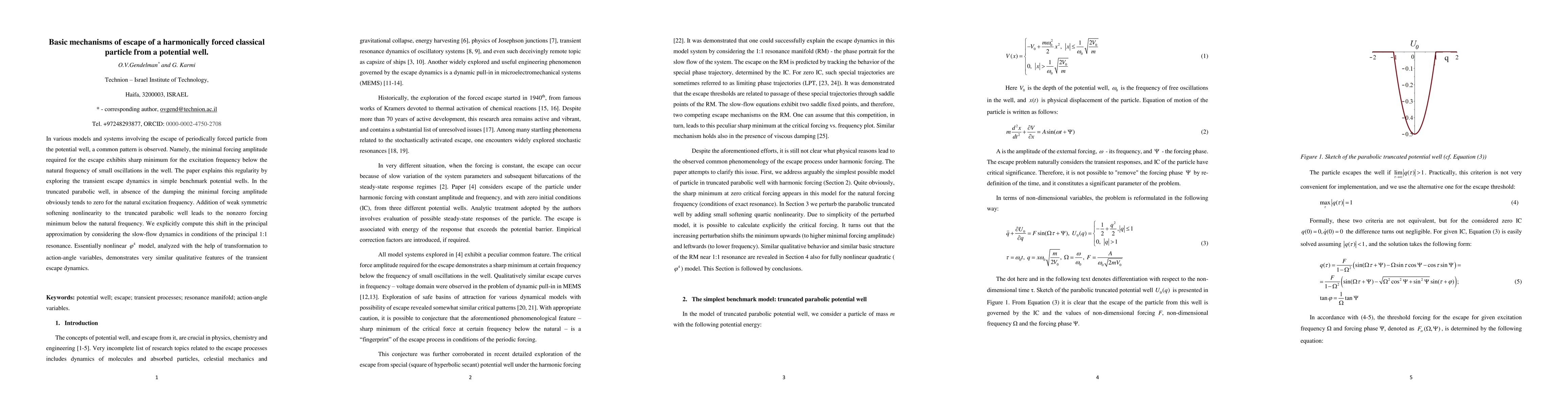 This paper investigates the escape dynamics of a harmonically forced particle from a potential well, revealing a sharp minimum in the minimal forcing amplitude required for escape at frequencies below the natural oscillation frequency. The study finds that adding a weak symmetric softening nonlinearity shifts this minimum, computed through analysis in the principal 1:1 resonance approximation.