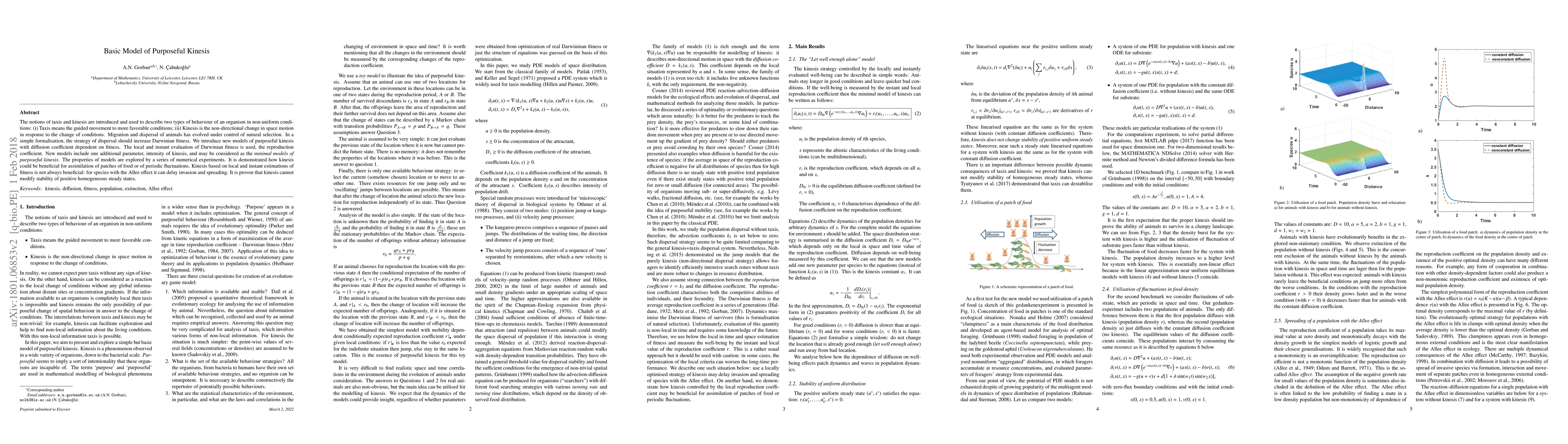 The notions of taxis and kinesis are introduced and used to describe two types of behavior of an organism in non-uniform conditions: (i) Taxis means the guided movement to more favorable conditions; (ii) Kinesis is the non-directional change in space motion in response to the change of conditions. Migration and dispersal of animals has evolved under control of natural selection. In a simple formalisation, the strategy of dispersal should increase Darwinian fitness. We introduce new models of purposeful kinesis with diffusion coefficient dependent on fitness. The local and instant evaluation of Darwinian fitness is used, the reproduction coefficient. New models include one additional parameter, intensity of kinesis, and may be considered as the {\em minimal models of purposeful kinesis}. The properties of models are explored by a series of numerical experiments. It is demonstrated how kinesis could be beneficial for assimilation of patches of food or of periodic fluctuations. Kinesis based on local and instant estimations of fitness is not always beneficial: for species with the Allee effect it can delay invasion and spreading. It is proven that kinesis cannot modify stability of positive homogeneous steady states.