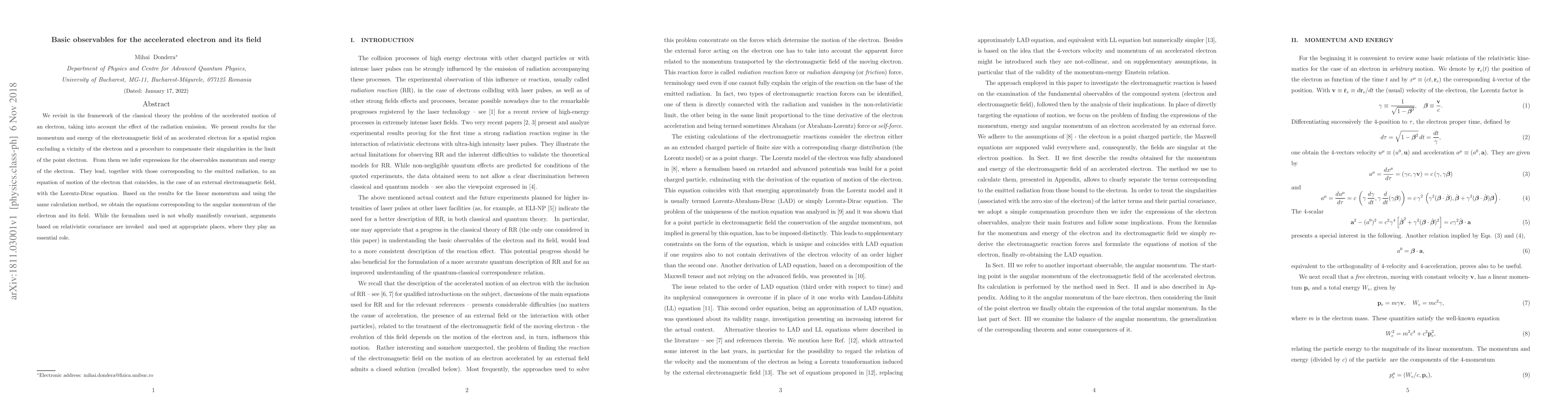 We revisit in the framework of the classical theory the problem of the accelerated motion of an electron, taking into account the effect of the radiation emission. We present results for the momentum and energy of the electromagnetic field of an accelerated electron for a spatial region excluding a vicinity of the electron and a procedure to compensate their singularities in the limit of the point electron. From them we infer expressions for the observables momentum and energy of the electron. They lead, together with those corresponding to the emitted radiation, to an equation of motion of the electron that coincides, in the case of an external electromagnetic field, with the Lorentz-Dirac equation. Based on the results for the linear momentum and using the same calculation method, we obtain the equations corresponding to the angular momentum of the electron and its field. While the formalism used is not wholly manifestly covariant, arguments based on relativistic covariance are invoked and used at appropriate places, where they play an essential role.