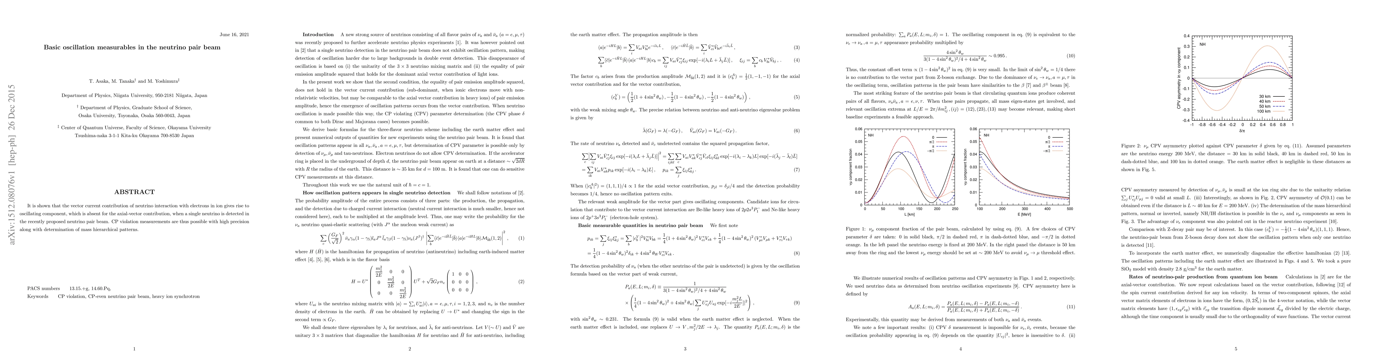 This paper demonstrates that the vector current in neutrino interactions with electrons leads to an oscillating component in a neutrino pair beam, enabling precise CP violation measurements and determination of mass hierarchy patterns, unlike axial-vector contributions.