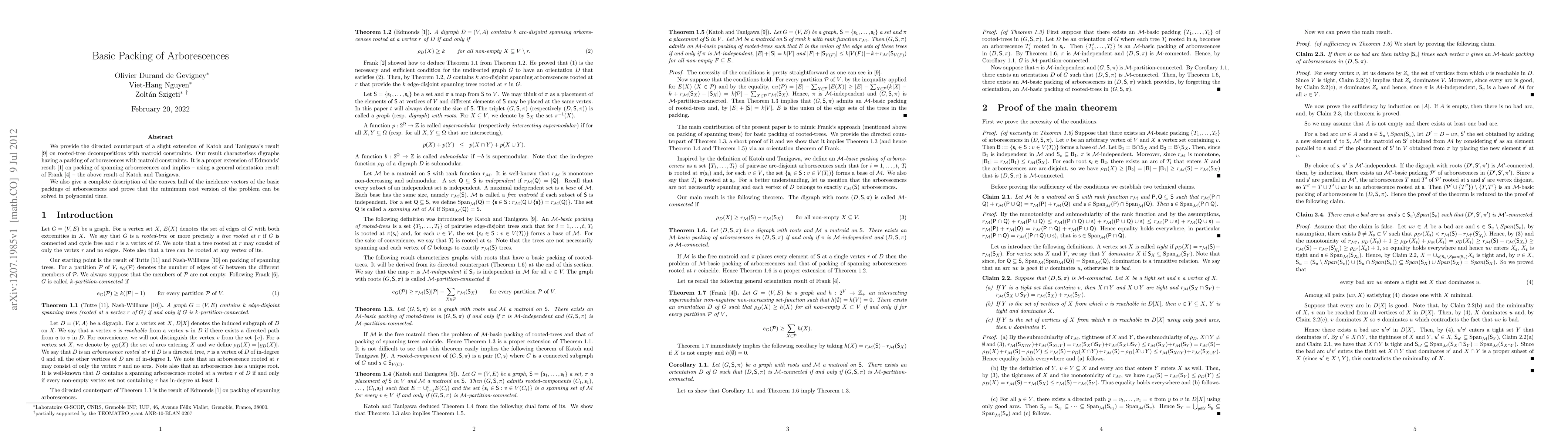 This paper extends Katoh and Tanigawa's result on rooted-tree decompositions with matroid constraints to directed graphs, characterizing digraphs with packings of arborescences under these constraints. It also describes the convex hull of incidence vectors of basic packings and proves the polynomial-time solvability of the minimum cost version.