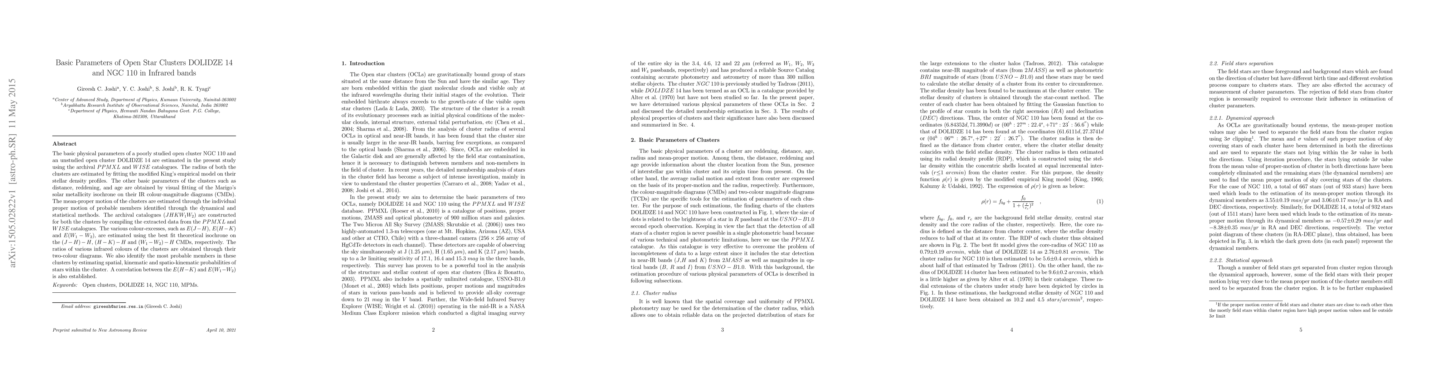 The basic physical parameters of a poorly studied open cluster NGC 110 and an unstudied open cluster DOLIDZE 14 are estimated in the present study using the archival PPMXL and WISE catalogues. The radius of both the clusters are estimated by fitting the modified King's empirical model on their stellar density profiles. The other basic parameters of the clusters such as distance, reddening, and age are obtained by visual fitting of the Marigo's solar metallicity isochrone on their IR colour-magnitude diagrams (CMDs). The mean-proper motion of the clusters are estimated through the individual proper motion of probable members identified through the dynamical and statistical methods. The archival catalogues (JHKW1W2) are constructed for both the clusters by compiling the extracted data from the PPMXL and WISE catalogues. The various colour-excesses, such as E(J-H), E(H-K) and E(W1-W2), are estimated using the best fit theoretical isochrone on the (J-H)-H, (H-K)-H and (W1-W2)-H CMDs, respectively. The ratios of various infrared colours of the clusters are obtained through their two-colour diagrams. We also identify the most probable members in these clusters by estimating spatial, kinematic and spatio-kinematic probabilities of stars within the cluster. A correlation between the E(H-K) and E(W1-W2) is also established.