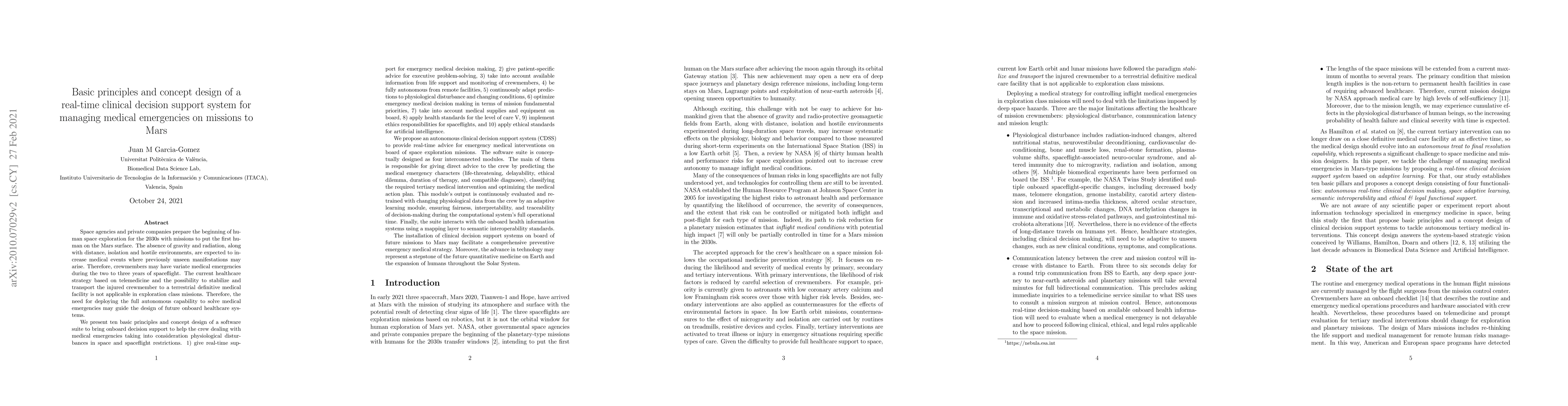 This paper outlines the fundamental principles and conceptual design of a real-time clinical decision support system (CDSS) for managing medical emergencies during Mars missions. The proposed CDSS aims to provide autonomous, real-time advice for emergency medical interventions, considering physiological disturbances and mission constraints unique to space exploration.