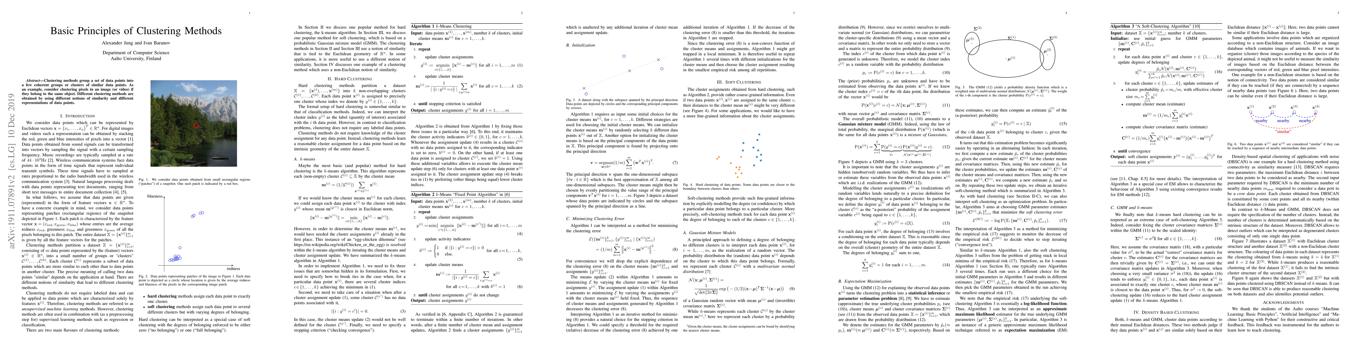 Clustering methods group a set of data points into a few coherent groups or clusters of similar data points. As an example, consider clustering pixels in an image (or video) if they belong to the same object. Different clustering methods are obtained by using different notions of similarity and different representations of data points.