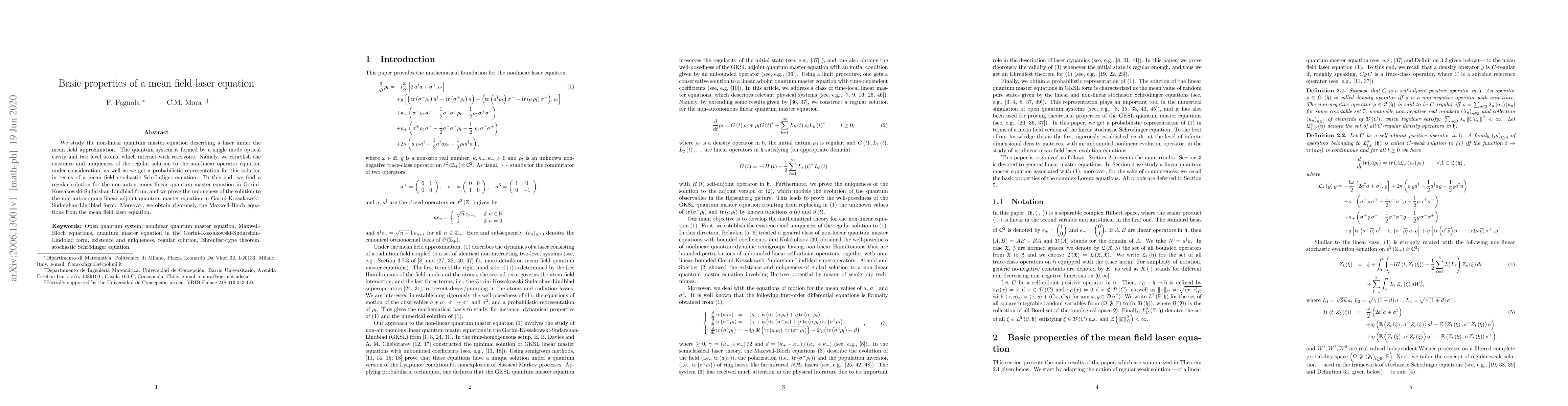 We study the non-linear quantum master equation describing a laser under the mean field approximation. The quantum system is formed by a single mode optical cavity and two level atoms, which interact with reservoirs. Namely, we establish the existence and uniqueness of the regular solution to the non-linear operator equation under consideration, as well as we get a probabilistic representation for this solution in terms of a mean field stochastic Schr\"ondiger equation. To this end, we find a regular solution for the non-autonomous linear quantum master equation in Gorini-Kossakowski-Sudarshan-Lindblad form, and we prove the uniqueness of the solution to the non-autonomous linear adjoint quantum master equation in Gorini-Kossakowski-Sudarshan-Lindblad form. Moreover, we obtain rigorously the Maxwell-Bloch equations from the mean field laser equation.