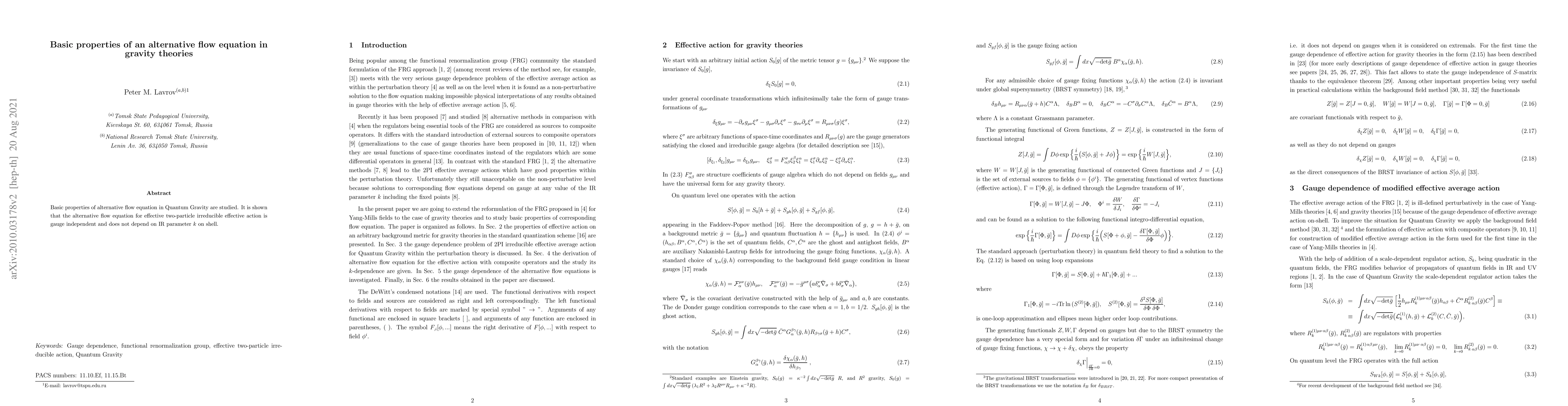 Basic properties of alternative flow equation in Quantum Gravity are studied. It is shown that the alternative flow equation for effective two-particle irreducible effective action is gauge independent and does not depend on IR parameter $k$ on shell.