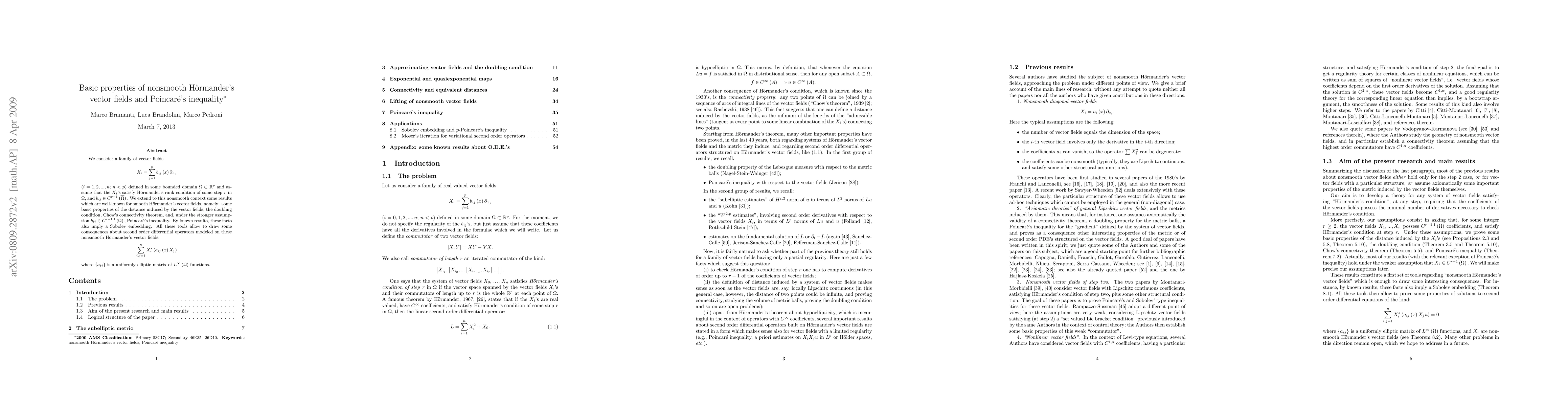 This paper extends properties of smooth Hormander's vector fields, such as the doubling condition and Chow's connectivity theorem, to nonsmooth vector fields satisfying Hormander's rank condition and having continuous derivatives up to order r-1. It also proves Poincare's inequality for these nonsmooth fields under stronger smoothness assumptions, leading to implications for related second-order differential operators.