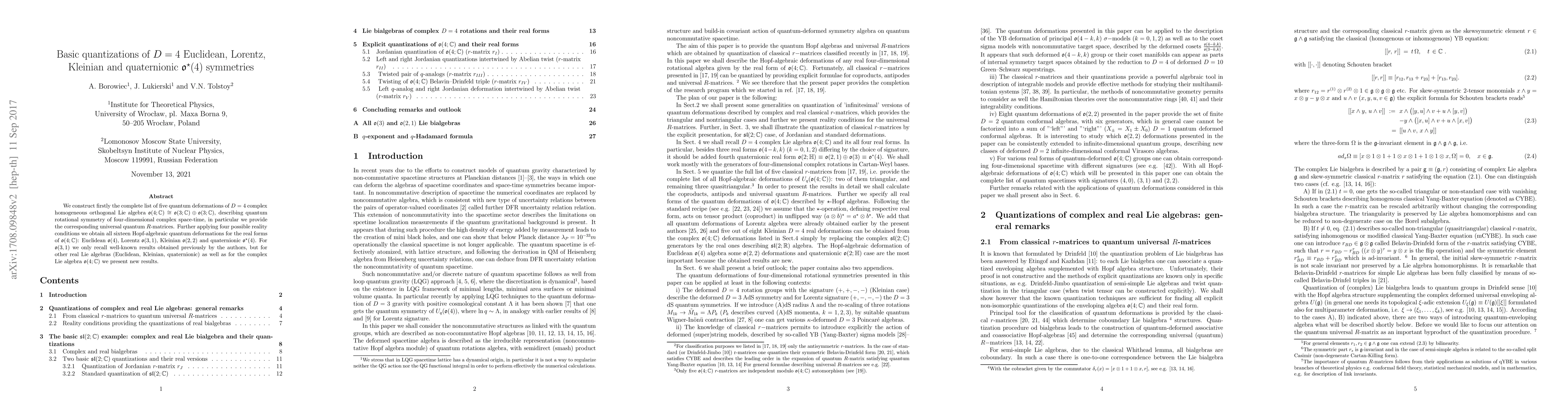 This paper presents the complete list of quantum deformations for the $D=4$ complex homogeneous orthogonal Lie algebra $\mathfrak{o}(4;\mathbb{C})$, including universal quantum $R$-matrices. It also explores the real forms of this algebra under four reality conditions, yielding quantum deformations for Euclidean, Lorentz, Kleinian, and quaternionic symmetries.