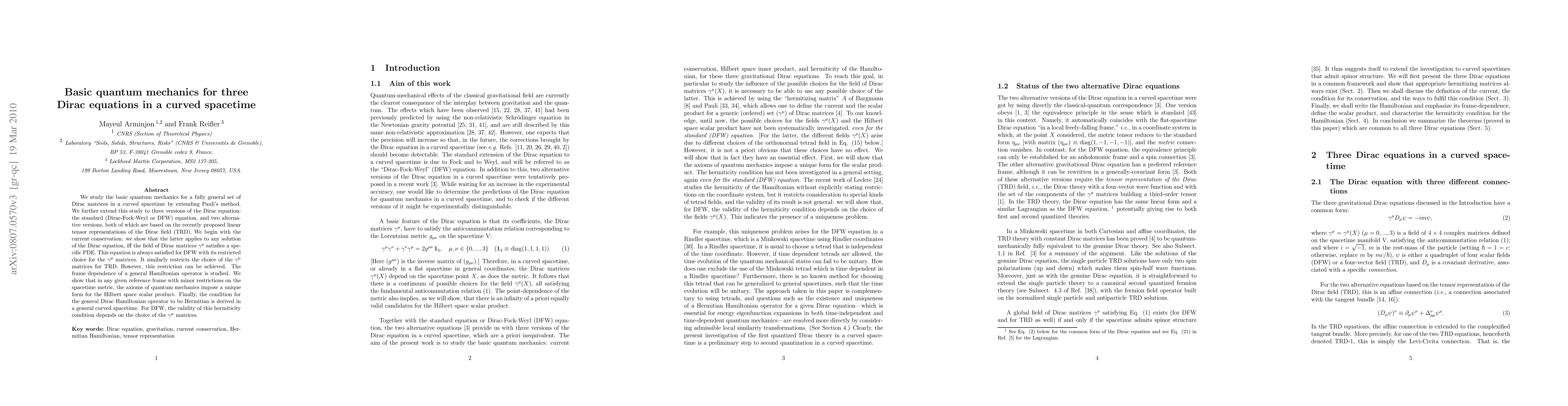 This paper explores the quantum mechanics of three versions of the Dirac equation in curved spacetime, extending Pauli's method. It establishes conditions for current conservation and derives the Hermitian condition for the general Dirac Hamiltonian operator, showing that the standard DFW equation and two alternative TRD versions have distinct constraints on their Dirac matrices.