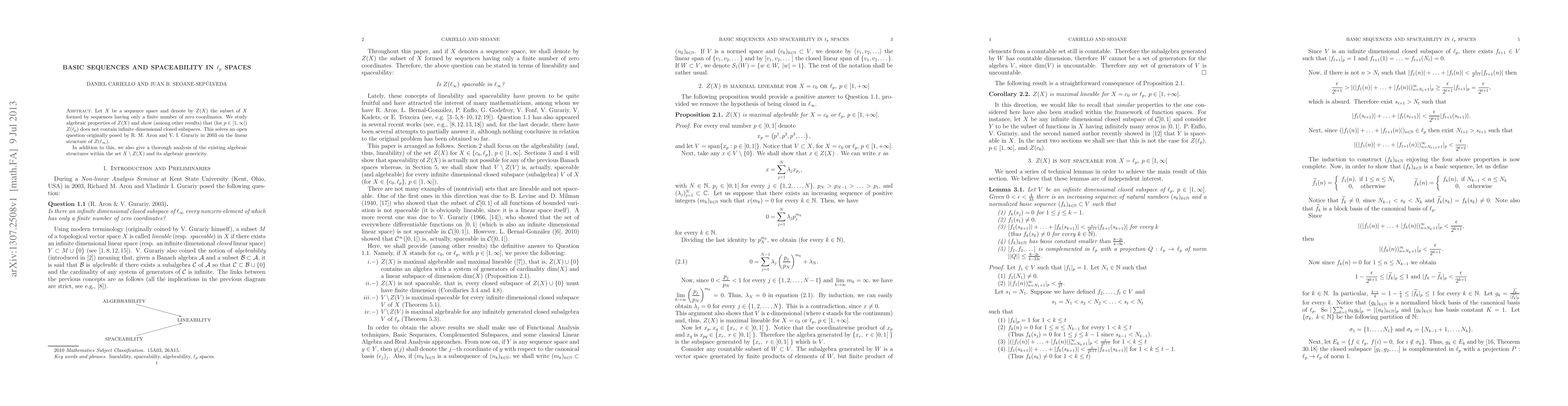 Let $X$ be a sequence space and denote by $Z(X)$ the subset of $X$ formed by sequences having only a finite number of zero coordinates. We study algebraic properties of $Z(X)$ and show (among other results) that (for $p \in [1,\infty]$) $Z(\ell_p)$ does not contain infinite dimensional closed subspaces. This solves an open question originally posed by R. M. Aron and V. I. Gurariy in 2003 on the linear structure of $Z(\ell_\infty)$. In addition to this, we also give a thorough analysis of the existing algebraic structures within the set $X \setminus Z(X)$ and its algebraic genericity.