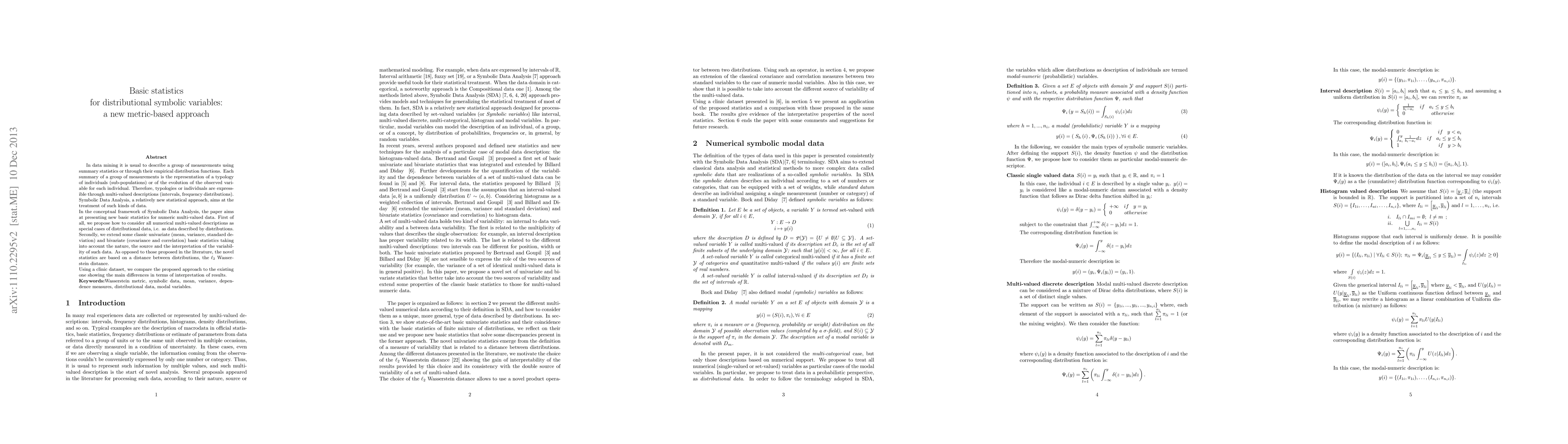 In data mining, it is usually to describe a set of individuals using some summaries (means, standard deviations, histograms, confidence intervals) that generalize individual descriptions into a typology description. In this case, data can be described by several values. In this paper, we propose an approach for computing basic statics for such data, and, in particular, for data described by numerical multi-valued variables (interval, histograms, discrete multi-valued descriptions). We propose to treat all numerical multi-valued variables as distributional data, i.e. as individuals described by distributions. To obtain new basic statistics for measuring the variability and the association between such variables, we extend the classic measure of inertia, calculated with the Euclidean distance, using the squared Wasserstein distance defined between probability measures. The distance is a generalization of the Wasserstein distance, that is a distance between quantile functions of two distributions. Some properties of such a distance are shown. Among them, we prove the Huygens theorem of decomposition of the inertia. We show the use of the Wasserstein distance and of the basic statistics presenting a k-means like clustering algorithm, for the clustering of a set of data described by modal numerical variables (distributional variables), on a real data set. Keywords: Wasserstein distance, inertia, dependence, distributional data, modal variables.