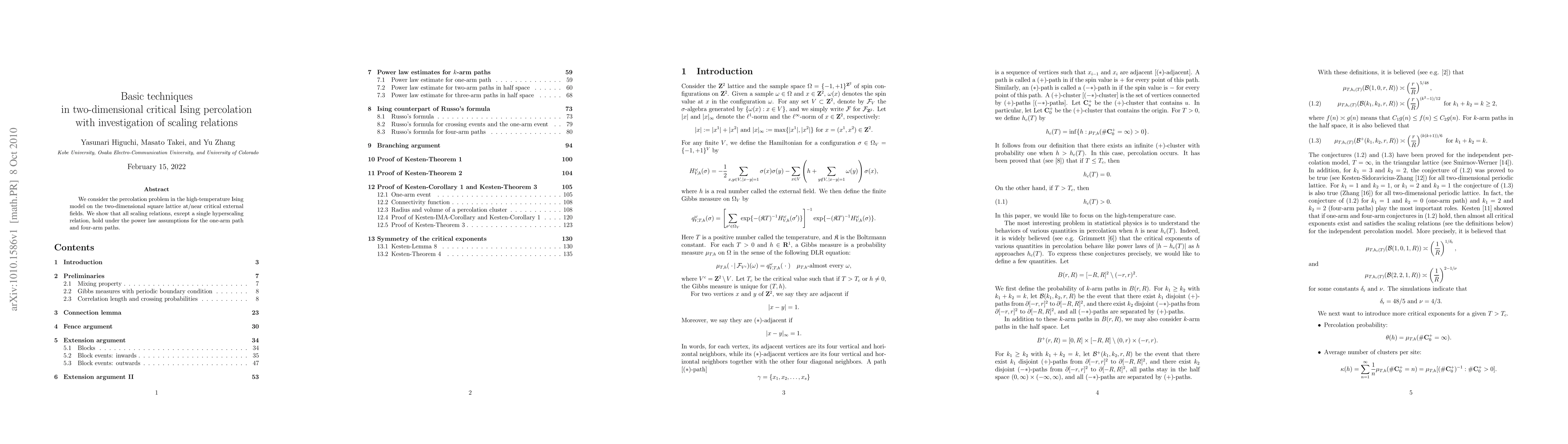 Summary: This paper investigates two-dimensional critical Ising percolation, confirming that most scaling relations hold under power law assumptions, except for a single hyperscaling relation. Techniques for analyzing one-arm and four-arm paths are discussed.