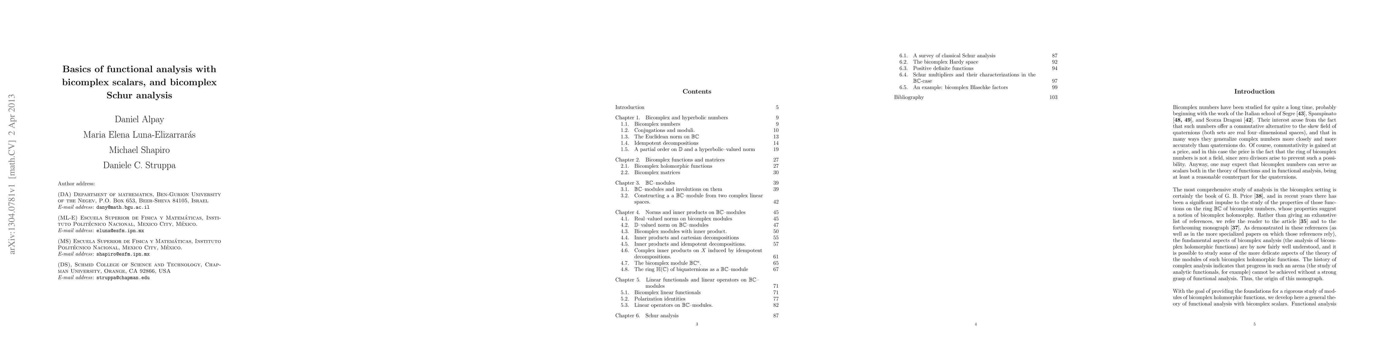With the goal of providing the foundations for a rigorous study of modules of bicomplex holomorphic functions, we develop a general theory of functional analysis with bicomplex scalars. Even though the basic properties of bicomplex number are well known and widely available, our analysis requires some more delicate discussion of the various structures which are hidden in the ring of bicomplex numbers. We study in particular matrices with bicomplex numbers, bicomplex modules, and inner products and norms in bicomplex modules. We consider two kinds of norms on bicomplex modules: a real-valued norm (as one would expect), and a hyperbolic-valued norm. Interestingly enough, while both norms can be used to build the theory of normed bicomplex modules, the hyperbolic-valued norm appears to be much better compatible with the structure of bicomplex modules. We also consider linear functionals on bicomplex numbers. To conclude we describe a bicomplex version of classical Schur analysis