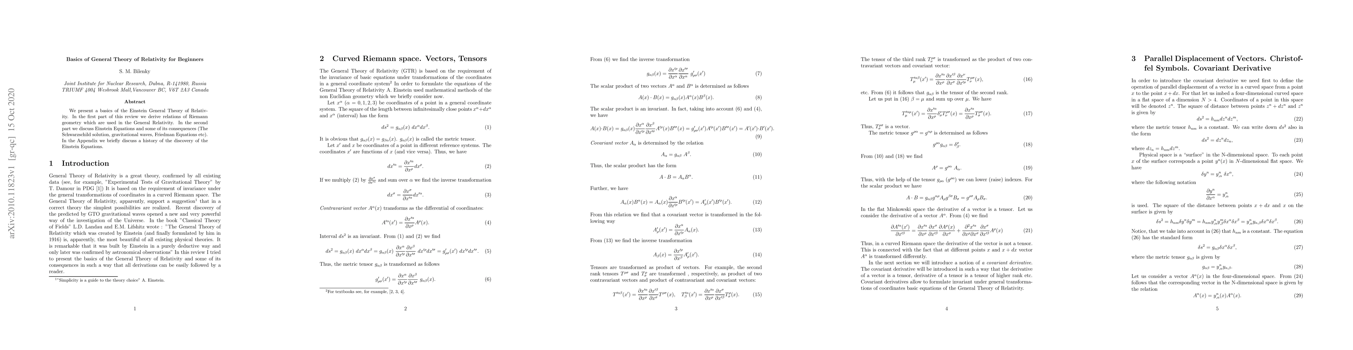 We present a basics of the Einstein General Theory of Relativity. In the first part of this review we derive relations of Riemann geometry which are used in the General Relativity. In the second part we discuss Einstein Equations and some of its consequences (The Schwarzschild solution, gravitational waves, Friedman Equations etc). In the Appendix we briefly discuss a history of the discovery of the Einstein Equations.