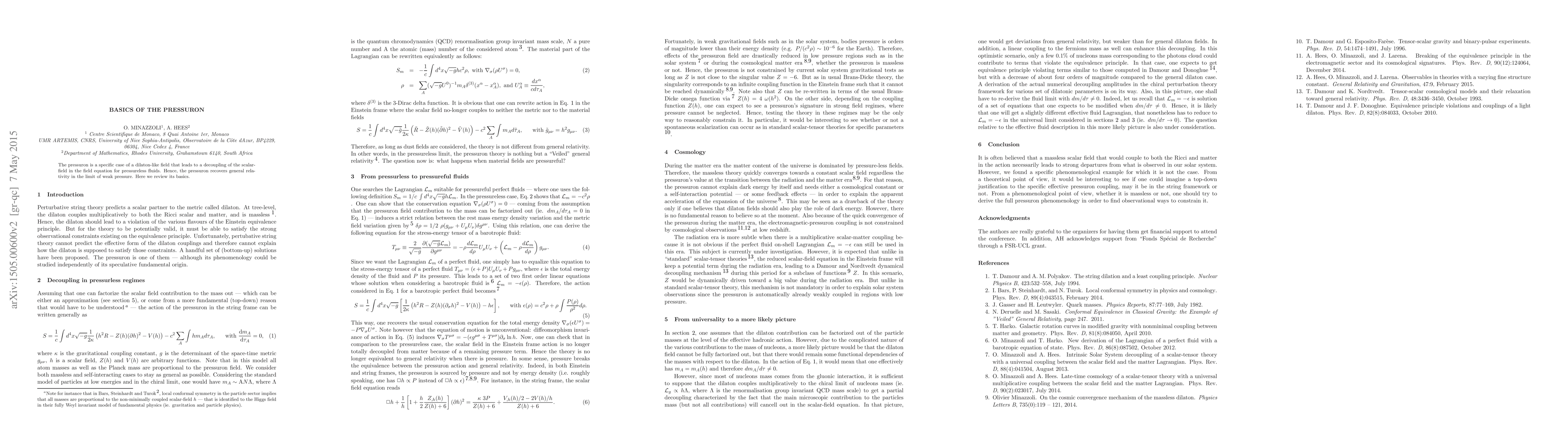 The pressuron is a specific case of a dilaton-like field that leads to a decoupling of the scalar-field in the field equation for pressureless fluids. Hence, the pressuron recovers general relativity in the limit of weak pressure. Here we review its basics.