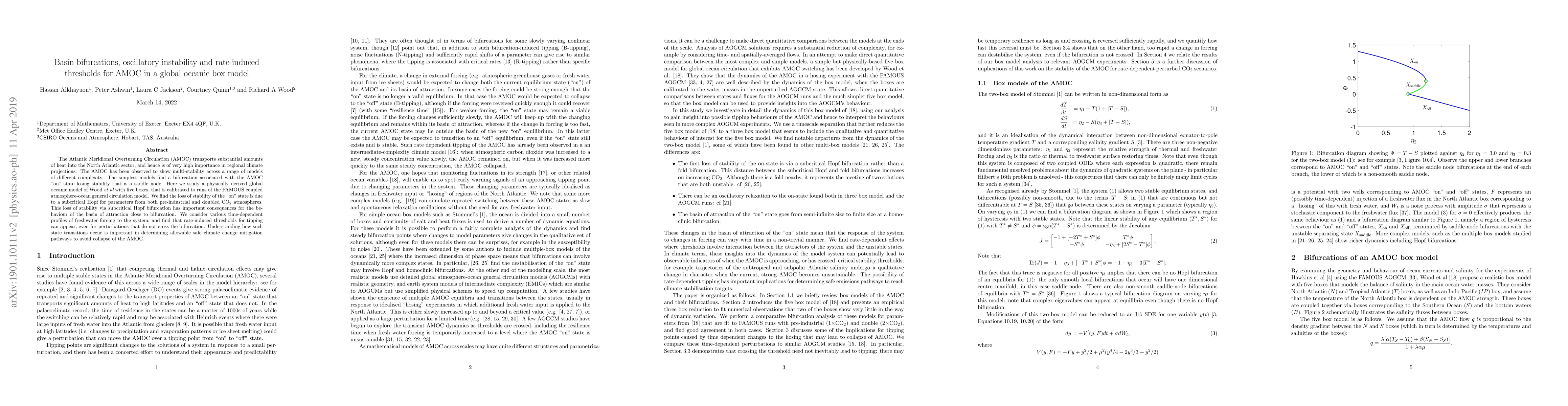 The Atlantic Meridional Overturning Circulation (AMOC) transports substantial amounts of heat into the North Atlantic sector, and hence is of very high importance in regional climate projections. The AMOC has been observed to show multi-stability across a range of models of different complexity. The simplest models find a bifurcation associated with the AMOC `on' state losing stability that is a saddle node. Here we study a physically derived global oceanic model of Wood {\em et al} with five boxes, that is calibrated to runs of the FAMOUS coupled atmosphere-ocean general circulation model. We find the loss of stability of the `on' state is due to a subcritical Hopf for parameters from both pre-industrial and doubled CO${}_2$ atmospheres. This loss of stability via subcritical Hopf bifurcation has important consequences for the behaviour of the basin of attraction close to bifurcation. We consider various time-dependent profiles of freshwater forcing to the system, and find that rate-induced thresholds for tipping can appear, even for perturbations that do not cross the bifurcation. Understanding how such state transitions occur is important in determining allowable safe climate change mitigation pathways to avoid collapse of the AMOC.