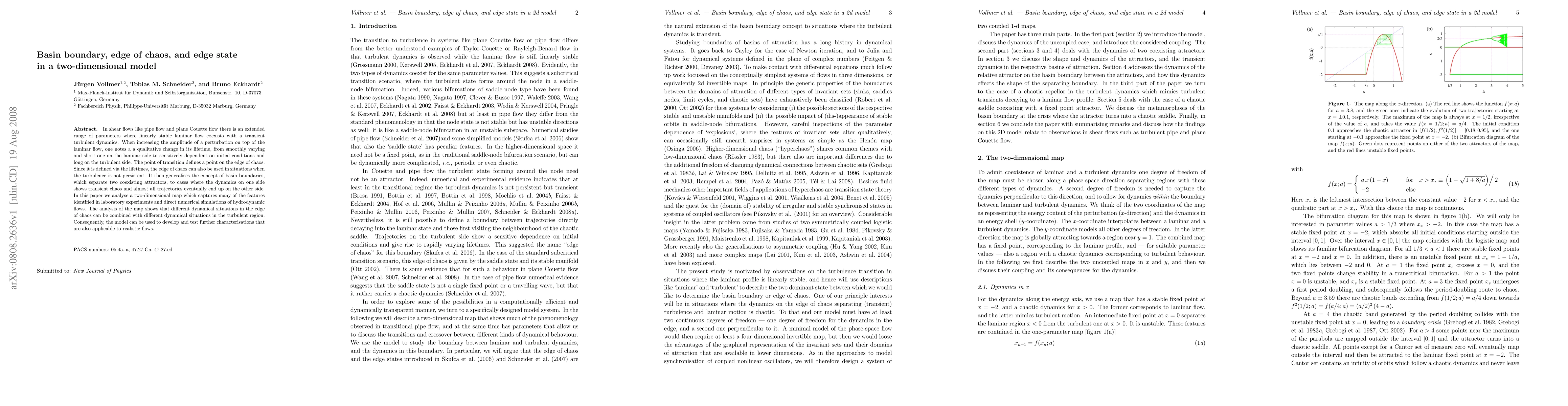 In shear flows like pipe flow and plane Couette flow there is an extended range of parameters where linearly stable laminar flow coexists with a transient turbulent dynamics. When increasing the amplitude of a perturbation on top of the laminar flow, one notes a a qualitative change in its lifetime, from smoothly varying and short one on the laminar side to sensitively dependent on initial conditions and long on the turbulent side. The point of transition defines a point on the edge of chaos. Since it is defined via the lifetimes, the edge of chaos can also be used in situations when the turbulence is not persistent. It then generalises the concept of basin boundaries, which separate two coexisting attractors, to cases where the dynamics on one side shows transient chaos and almost all trajectories eventually end up on the other side. In this paper we analyse a two-dimensional map which captures many of the features identified in laboratory experiments and direct numerical simulations of hydrodynamic flows. The analysis of the map shows that different dynamical situations in the edge of chaos can be combined with different dynamical situations in the turbulent region. Consequently, the model can be used to develop and test further characterisations that are also applicable to realistic flows.