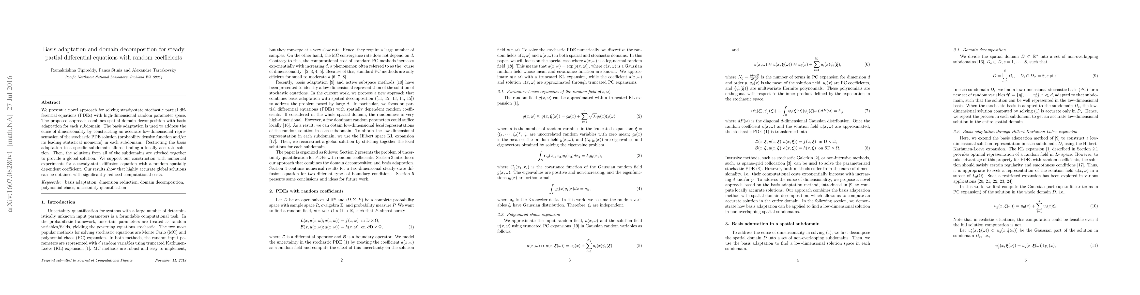 This paper proposes a novel method combining spatial domain decomposition and basis adaptation to solve high-dimensional stochastic PDEs. The approach constructs accurate low-dimensional representations in each subdomain, leading to globally accurate solutions with reduced computational costs. Numerical experiments demonstrate its effectiveness for a steady-state diffusion equation with random coefficients.