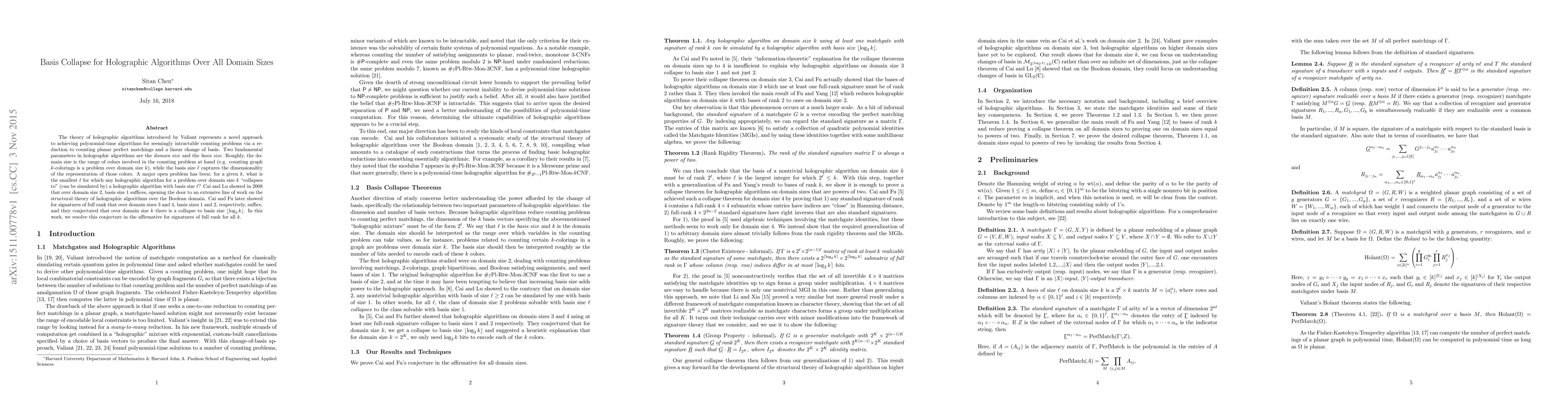 The paper presents a comprehensive proof of the basis collapse conjecture for holographic algorithms over all domain sizes, particularly for signatures of full rank.