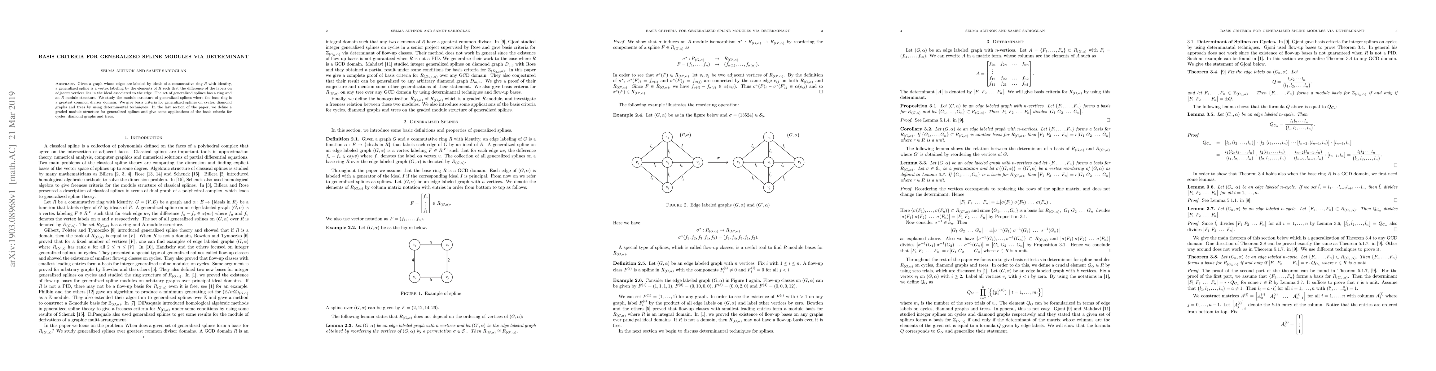 Given a graph whose edges are labeled by ideals of a commutative ring R with identity, a generalized spline is a vertex labeling by the elements of R such that the difference of the labels on adjacent vertices lies in the ideal associated to the edge. The set of generalized splines has a ring and an R-module structure. We study the module structure of generalized splines where the base ring is a greatest common divisor domain. We give basis criteria for generalized splines on cycles, diamond graphs and trees by using determinantal techniques. In the last section of the paper, we define a graded module structure for generalized splines and give some applications of the basis criteria for cycles, diamond graphs and trees.