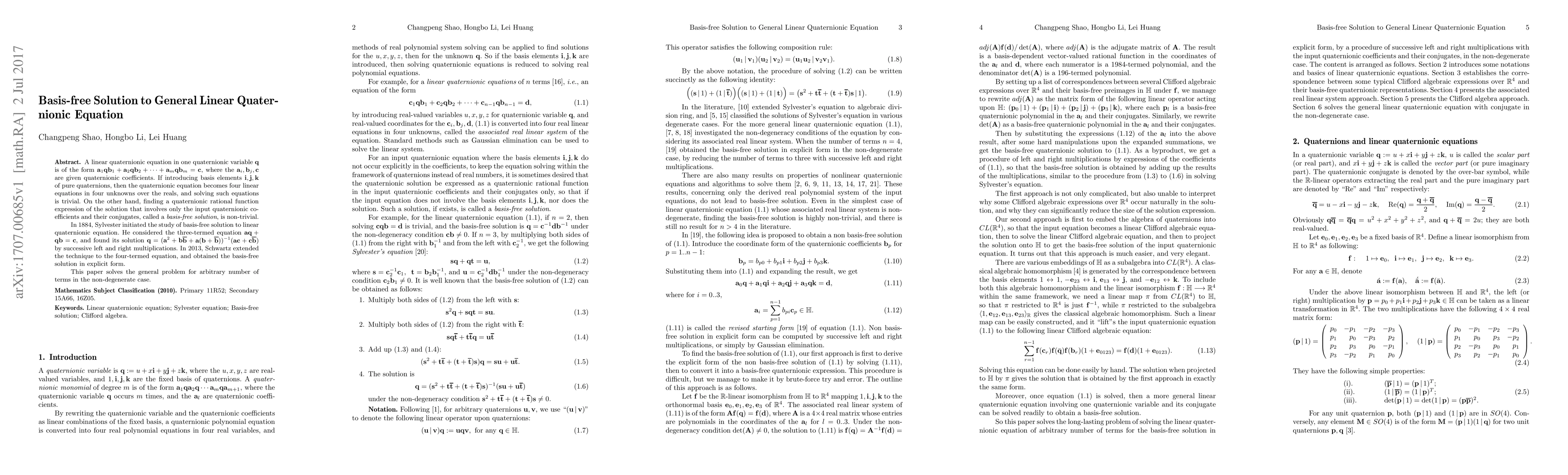 A linear quaternionic equation in one quaternionic variable q is of the form $a_1 q b_1+a_2 q b_2+ ... +a_m q b_m = c$, where the $a_i, b_j, c$ are given quaternionic coefficients. If introducing basis elements $\bf i, j, k$ of pure quaternions, then the quaternionic equation becomes four linear equations in four unknowns over the reals, and solving such equations is trivial. On the other hand, finding a quaternionic rational function expression of the solution that involves only the input quaternionic coefficients and their conjugates, called a basis-free solution, is non-trivial. In 1884, Sylvester initiated the study of basis-free solution to linear quaternionic equation. He considered the three-termed equation $aq+qb=c$, and found its solution $q=(a^2+b\overline{b}+a(b+\overline{b}))^{-1}(ac+c\overline{b})$ by successive left and right multiplications. In 2013, Schwartz extended the technique to the four-termed equation, and obtained the basis-free solution in explicit form. This paper solves the general problem for arbitrary number of terms in the non-degenerate case.