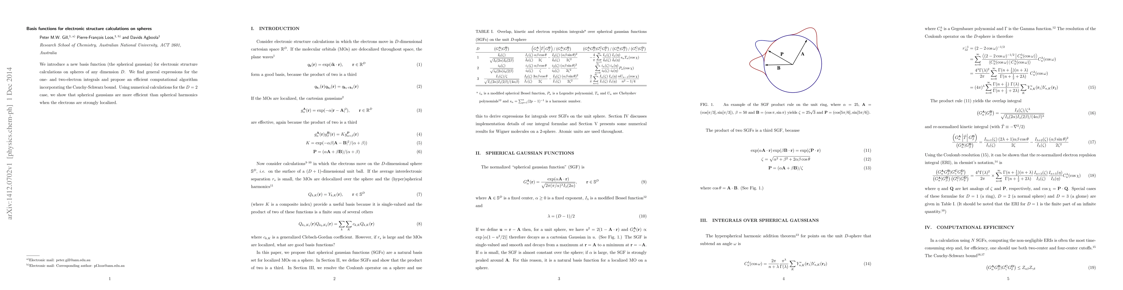 This paper introduces a new basis function, the spherical gaussian, for electronic structure calculations on spheres of any dimension. It proposes efficient computational methods and shows that spherical gaussians outperform spherical harmonics for strongly localized electrons in numerical calculations.