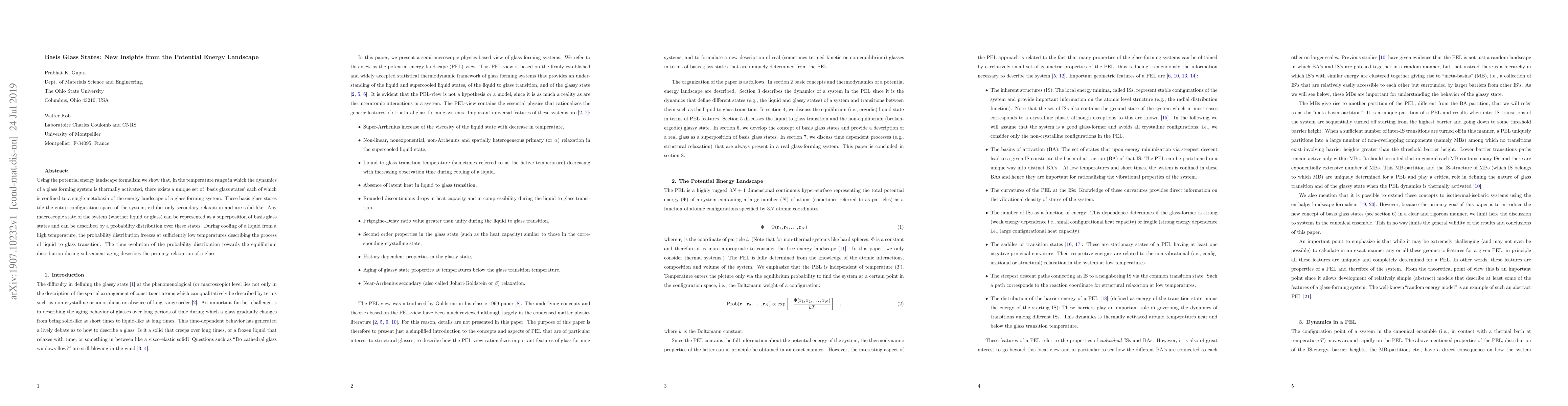 This paper introduces "basis glass states" within the potential energy landscape, revealing that these states form a unique set confined to individual metabasins, representing solid-like secondary relaxation. Macroscopic states of glass-forming systems can be described by a superposition of these basis states, with the probability distribution freezing during the liquid to glass transition.