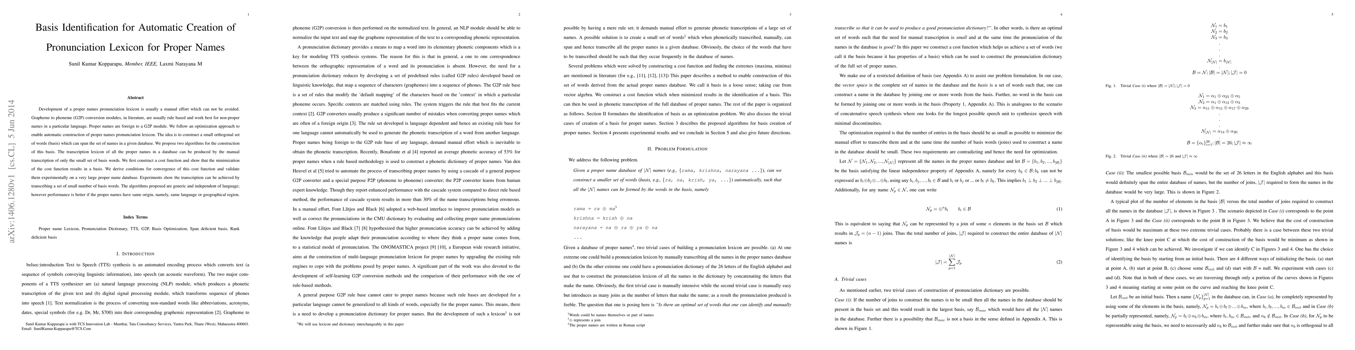 Development of a proper names pronunciation lexicon is usually a manual effort which can not be avoided. Grapheme to phoneme (G2P) conversion modules, in literature, are usually rule based and work best for non-proper names in a particular language. Proper names are foreign to a G2P module. We follow an optimization approach to enable automatic construction of proper names pronunciation lexicon. The idea is to construct a small orthogonal set of words (basis) which can span the set of names in a given database. We propose two algorithms for the construction of this basis. The transcription lexicon of all the proper names in a database can be produced by the manual transcription of only the small set of basis words. We first construct a cost function and show that the minimization of the cost function results in a basis. We derive conditions for convergence of this cost function and validate them experimentally on a very large proper name database. Experiments show the transcription can be achieved by transcribing a set of small number of basis words. The algorithms proposed are generic and independent of language; however performance is better if the proper names have same origin, namely, same language or geographical region.