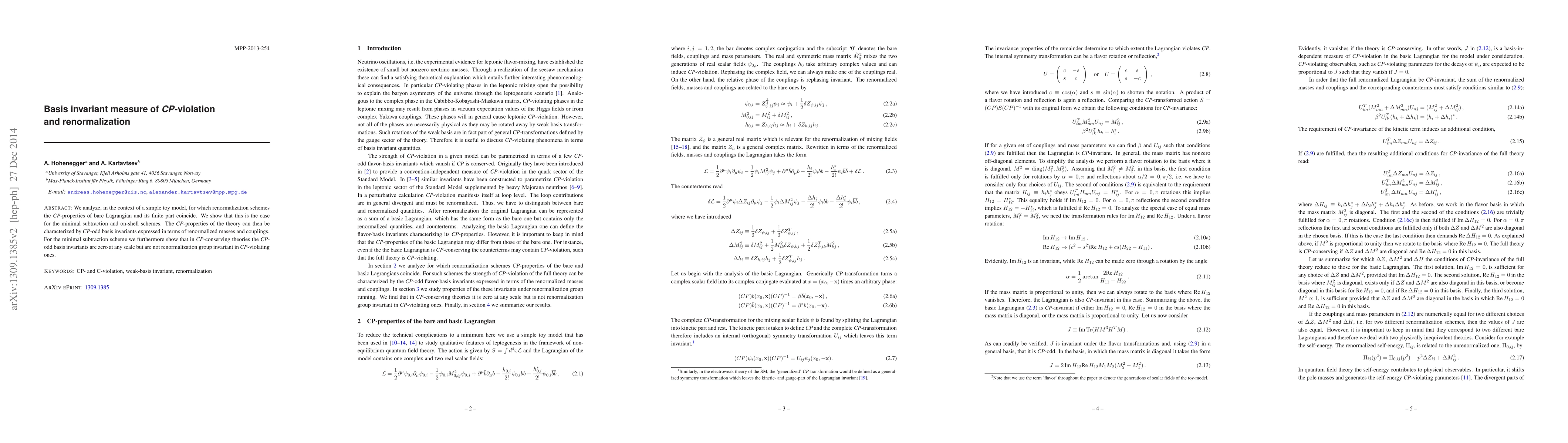 We analyze, in the context of a simple toy model, for which renormalization schemes the CP-properties of bare Lagrangian and its finite part coincide. We show that this is the case for the minimal subtraction and on-shell schemes. The CP-properties of the theory can then be characterized by CP-odd basis invariants expressed in terms of renormalized masses and couplings. For the minimal subtraction scheme we furthermore show that in CP-conserving theories the CP-odd basis invariants are zero at any scale but are not renormalization group invariant in CP-violating ones.