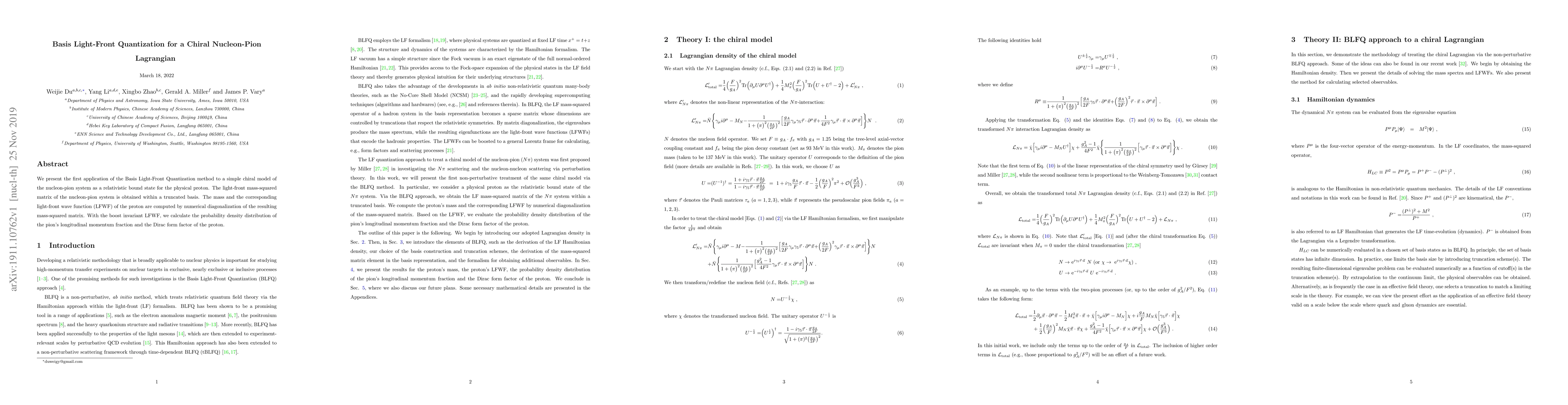 This paper applies Basis Light-Front Quantization to a chiral nucleon-pion model, obtaining the proton's mass and light-front wave function through numerical diagonalization. It also computes the pion's momentum fraction and the proton's Dirac form factor using the resulting boost invariant wave function.