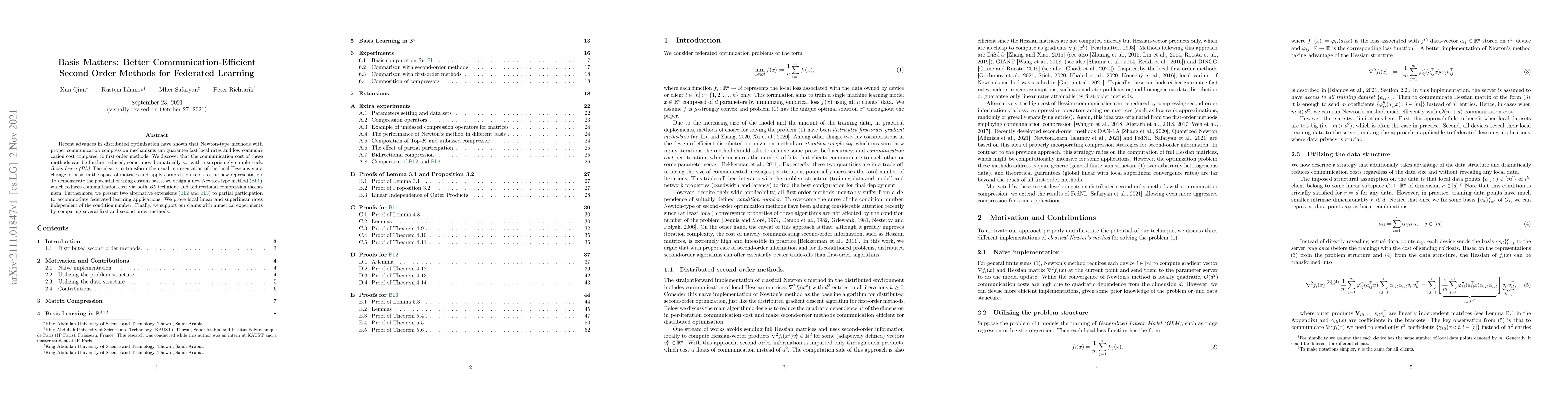 This paper proposes a new communication-efficient second-order method called BL1 for federated learning, which leverages the "Basis Learn" technique to transform local Hessians and reduce communication costs. The paper also presents extensions BL2 and BL3 for partial participation and proves convergence rates independent of the condition number, supported by numerical comparisons.