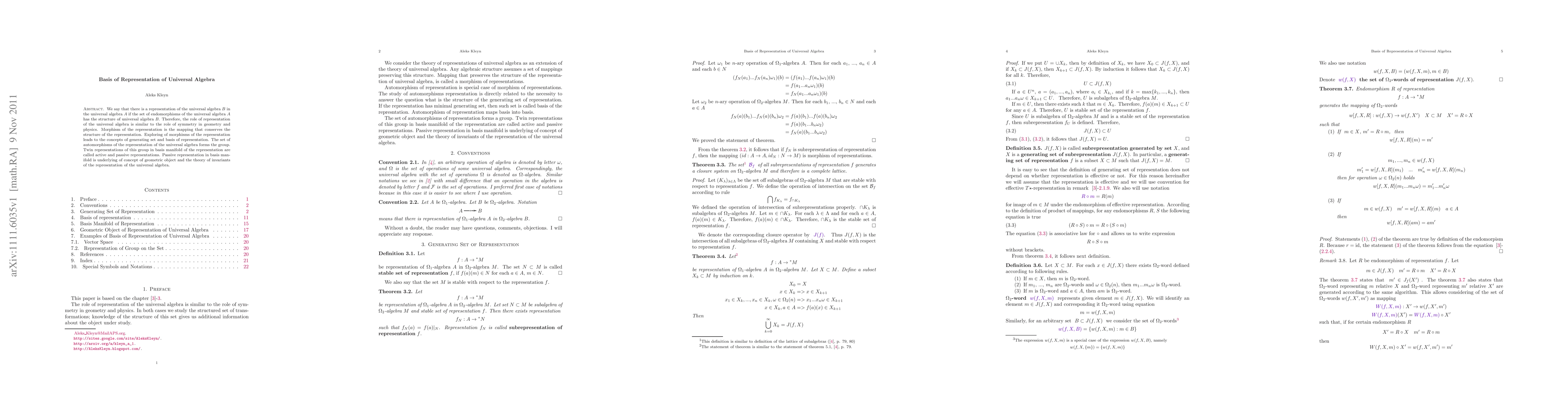 This paper investigates the concept of representation in universal algebra, where a universal algebra B is represented in another algebra A if A's endomorphisms form B's structure. Morphisms preserving this representation lead to the notions of generating sets and bases, and the study of their automorphisms forms a group with active and passive twin representations. The passive representation underpins geometric objects and invariant theory.