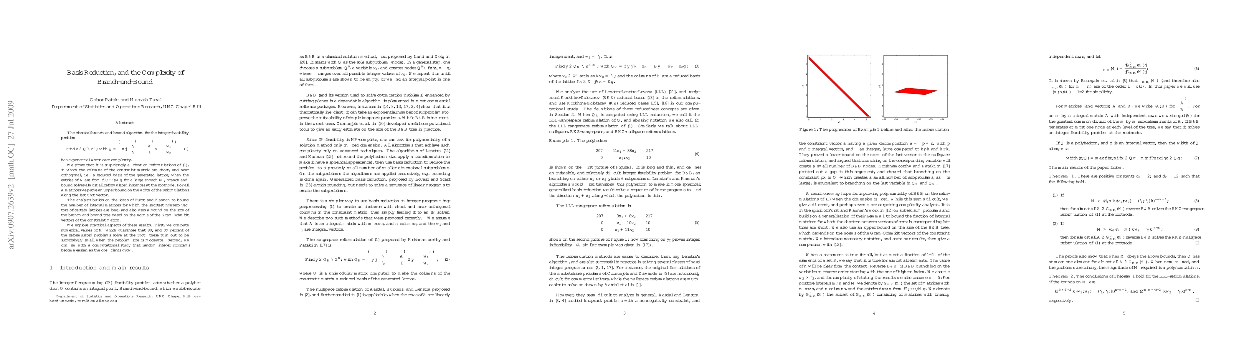 The classical branch-and-bound algorithm for the integer feasibility problem has exponential worst case complexity. We prove that it is surprisingly efficient on reformulated problems, in which the columns of the constraint matrix are short, and near orthogonal, i.e. a reduced basis of the generated lattice; when the entries of A (the dense part of the constraint matrix) are from {1, ..., M} for a large enough M, branch-and-bound solves almost all reformulated instances at the rootnode. We also prove an upper bound on the width of the reformulations along the last unit vector. The analysis builds on the ideas of Furst and Kannan to bound the number of integral matrices for which the shortest vectors of certain lattices are long, and also uses a bound on the size of the branch-and-bound tree based on the norms of the Gram-Schmidt vectors of the constraint matrix. We explore practical aspects of these results. First, we compute numerical values of M which guarantee that 90, and 99 percent of the reformulated problems solve at the root: these turn out to be surprisingly small when the problem size is moderate. Second, we confirm with a computational study that random integer programs become easier, as the coefficients grow.