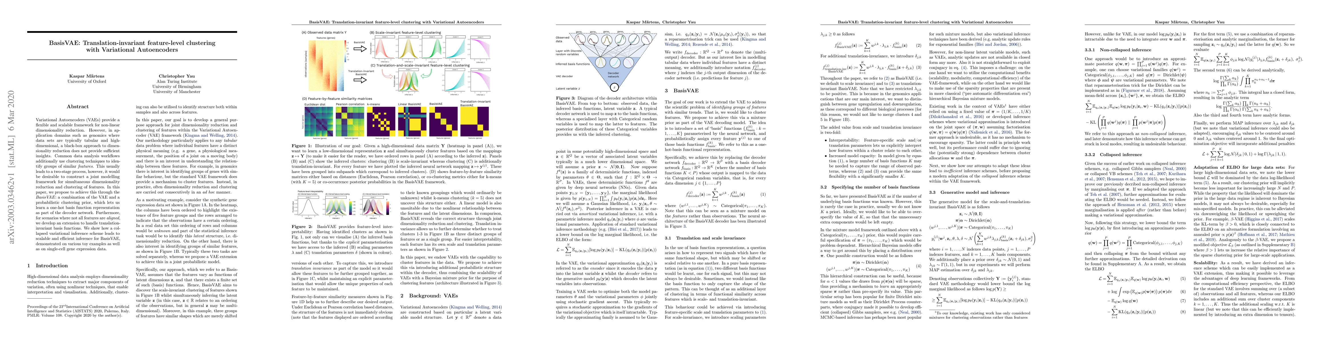 The BasisVAE integrates Variational Autoencoders with a probabilistic clustering prior to enable simultaneous dimensionality reduction and translation-invariant feature-level clustering, demonstrated effectively on single-cell gene expression data. This approach provides a scalable and efficient inference scheme for high-dimensional tabular data.