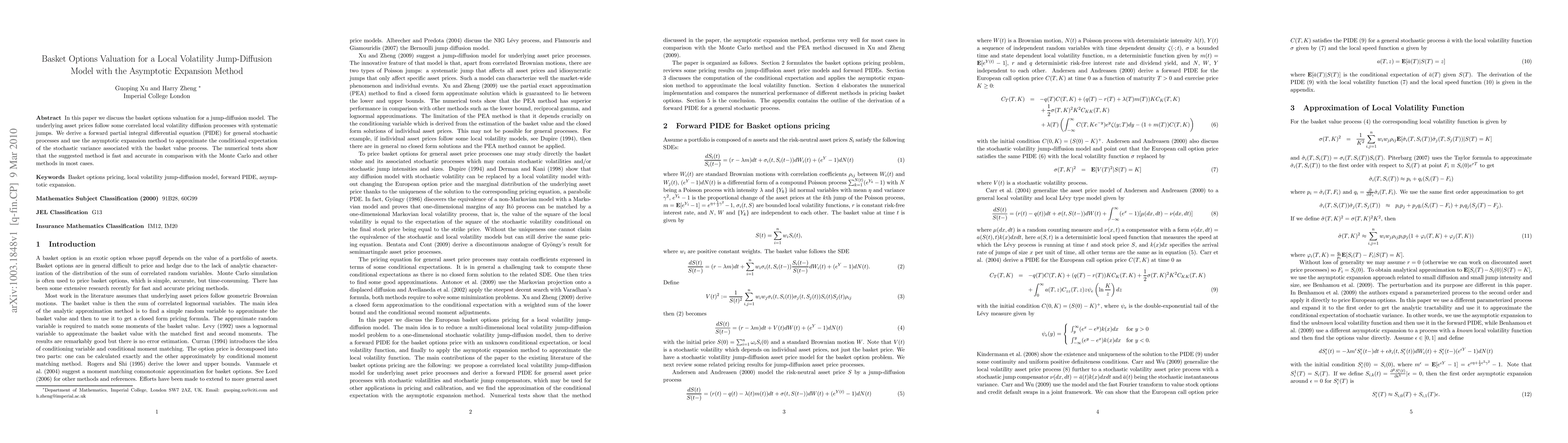 This paper proposes a valuation method for basket options under a local volatility jump-diffusion model, using an asymptotic expansion technique to approximate the conditional expectation of the stochastic variance. Numerical tests demonstrate its efficiency and accuracy compared to Monte Carlo and other methods.