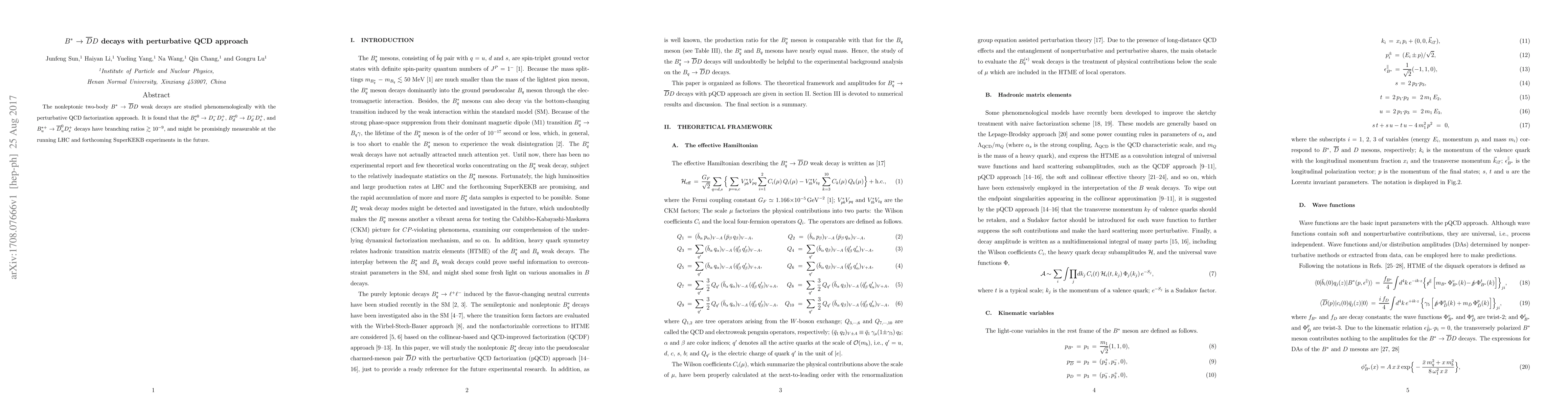 The nonleptonic two-body $B^{\ast}$ ${\to}$ $\bar{D}D$ weak decays are studied phenomenologically with the perturbative QCD factorization approach. It is found that the $B_{s}^{{\ast}0}$ ${\to}$ $D_{s}^{-}D_{s}^{+}$, $B_{d}^{{\ast}0}$ ${\to}$ $D_{d}^{-}D_{s}^{+}$, and $B_{u}^{{\ast}+}$ ${\to}$ $\bar{D}_{u}^{0}D_{s}^{+}$ decays have branching ratios ${\gtrsim}$ $10^{-9}$, and might be promisingly measurable at the running LHC and forthcoming SuperKEKB experiments in the future.