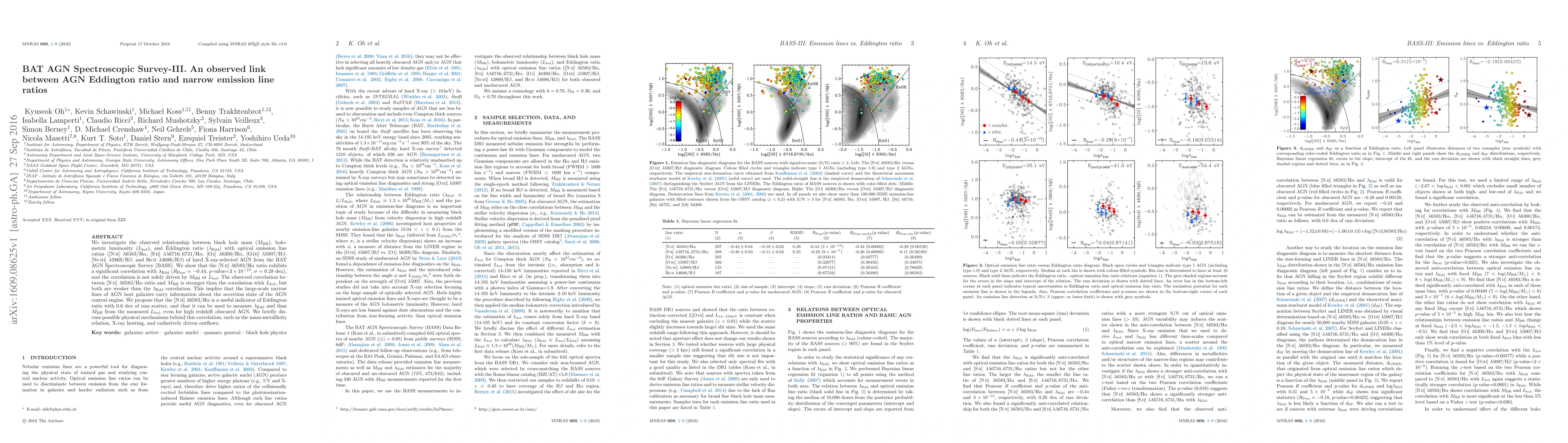 We investigate the observed relationship between black hole mass ($M_{\rm BH}$), bolometric luminosity ($L_{\rm bol}$), and Eddington ratio (${\lambda}_{\rm Edd}$) with optical emission line ratios ([NII] {\lambda}6583/H{\alpha}, [SII] {\lambda}{\lambda}6716,6731/H{\alpha}, [OI] {\lambda}6300/H{\alpha}, [OIII] {\lambda}5007/H{\beta}, [NeIII] {\lambda}3869/H{\beta}, and HeII {\lambda}4686/H{\beta}) of hard X-ray-selected AGN from the BAT AGN Spectroscopic Survey (BASS). We show that the [NII] {\lambda}6583/H{\alpha} ratio exhibits a significant correlation with ${\lambda}_{\rm Edd}$ ($R_{\rm Pear}$ = -0.44, $p$-value=$3\times10^{-13}$, {\sigma} = 0.28 dex), and the correlation is not solely driven by $M_{\rm BH}$ or $L_{\rm bol}$. The observed correlation between [NII] {\lambda}6583/H{\alpha} ratio and $M_{\rm BH}$ is stronger than the correlation with $L_{\rm bol}$, but both are weaker than the ${\lambda}_{\rm Edd}$ correlation. This implies that the large-scale narrow lines of AGN host galaxies carry information about the accretion state of the AGN central engine. We propose that the [NII] {\lambda}6583/H{\alpha} is a useful indicator of Eddington ratio with 0.6 dex of rms scatter, and that it can be used to measure ${\lambda}_{\rm Edd}$ and thus $M_{\rm BH}$ from the measured $L_{\rm bol}$, even for high redshift obscured AGN. We briefly discuss possible physical mechanisms behind this correlation, such as the mass-metallicity relation, X-ray heating, and radiatively driven outflows.