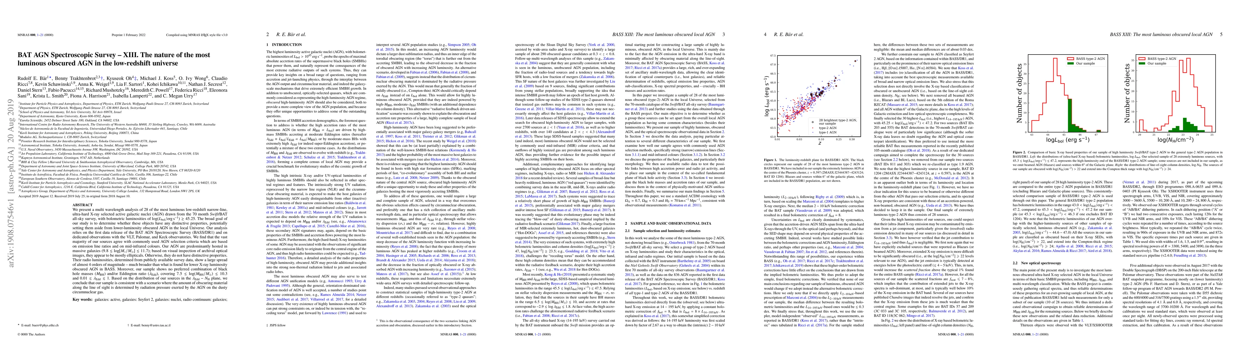 We present a multi wavelength analysis of 28 of the most luminous low-redshift narrow-line, ultra-hard X-ray selected active galactic nuclei (AGN) drawn from the 70 month Swift/BAT all-sky survey, with bolometric luminosities of log(L_bol/erg/s) > 45.25. The broad goal of our study is to determine whether these objects have any distinctive properties, potentially setting them aside from lower-luminosity obscured AGN in the local Universe. Our analysis relies on the first data release of the BAT AGN Spectroscopic Survey (BASS/DR1) and on dedicated observations with the VLT, Palomar, and Keck observatories. We find that the vast majority of our sources agree with commonly used AGN selection criteria which are based on emission line ratios and on mid-infrared colours. Our AGN are predominantly hosted in massive galaxies (9.8 < log(M_*/M_sun) < 11.7); based on visual inspection of archival optical images, they appear to be mostly ellipticals. Otherwise, they do not have distinctive properties. Their radio luminosities, determined from publicly available survey data, show a large spread of almost 4 orders of magnitude - much broader than what is found for lower X-ray luminosity obscured AGN in BASS. Moreover, our sample shows no preferred combination of black hole masses (M_BH) and/or Eddington ratio (lambda_Edd), covering 7.5 < log(M_BH/M_sun) < 10.3 and 0.01 < lambda_Edd < 1. Based on the distribution of our sources in the lambda_Edd-N_H plane, we conclude that our sample is consistent with a scenario where the amount of obscuring material along the line of sight is determined by radiation pressure exerted by the AGN on the dusty circumnuclear gas.