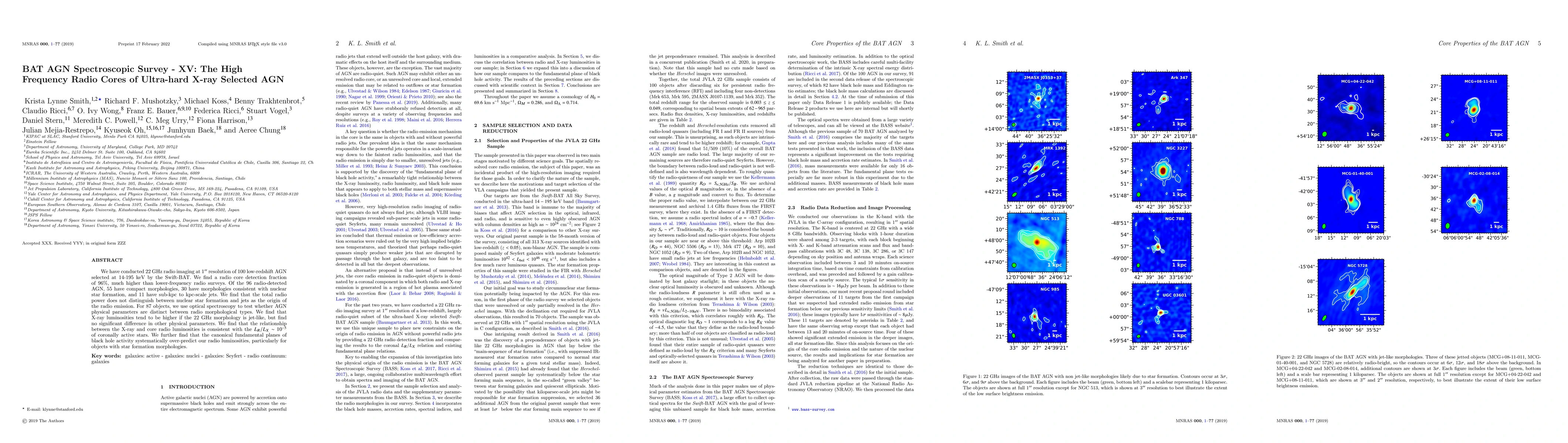 This paper reports on high-resolution 22 GHz radio imaging of 100 low-redshift AGN selected by ultra-hard X-ray criteria, revealing a 96% detection rate of radio cores with various morphologies. The study finds no significant distinction in physical parameters between AGN with jet-like and star-forming radio morphologies, except for higher X-ray luminosities in jet-like AGN.